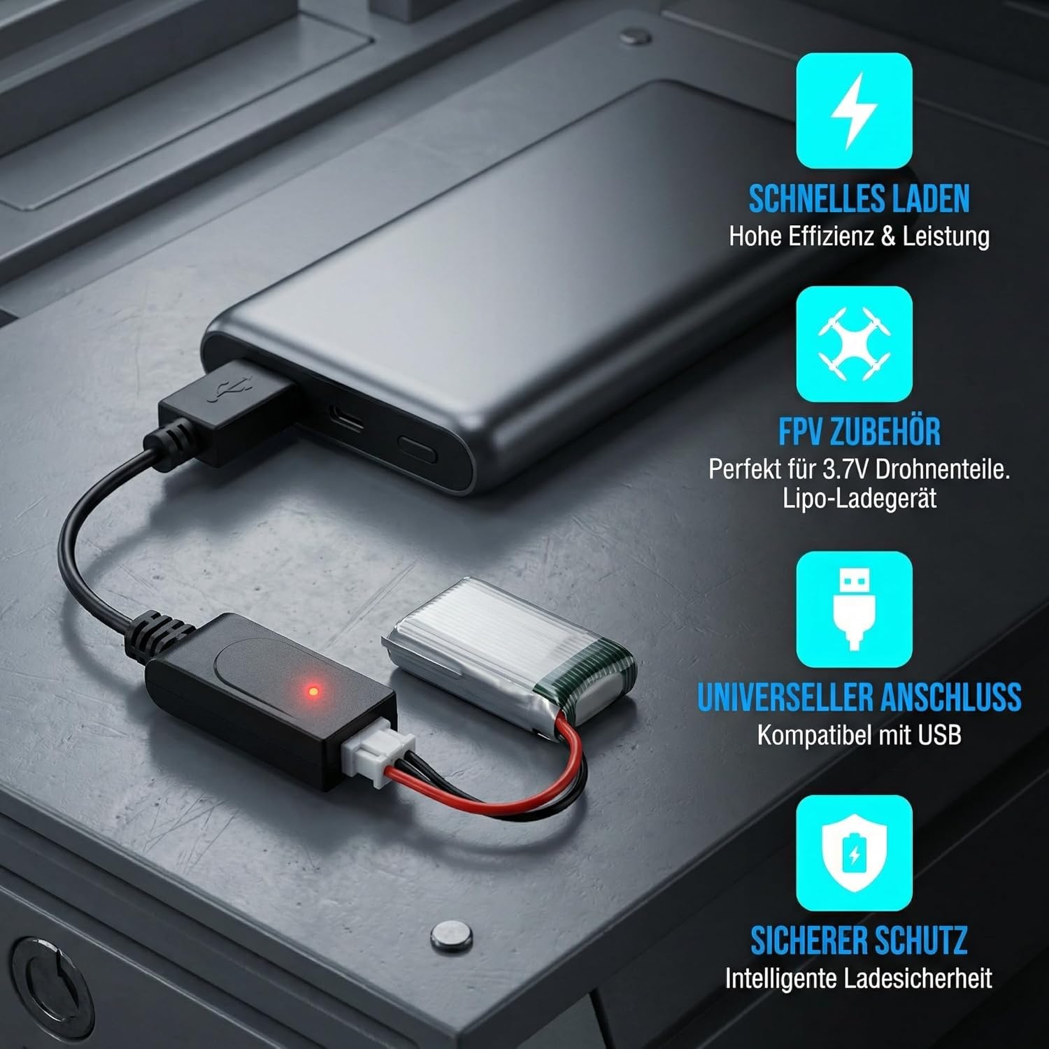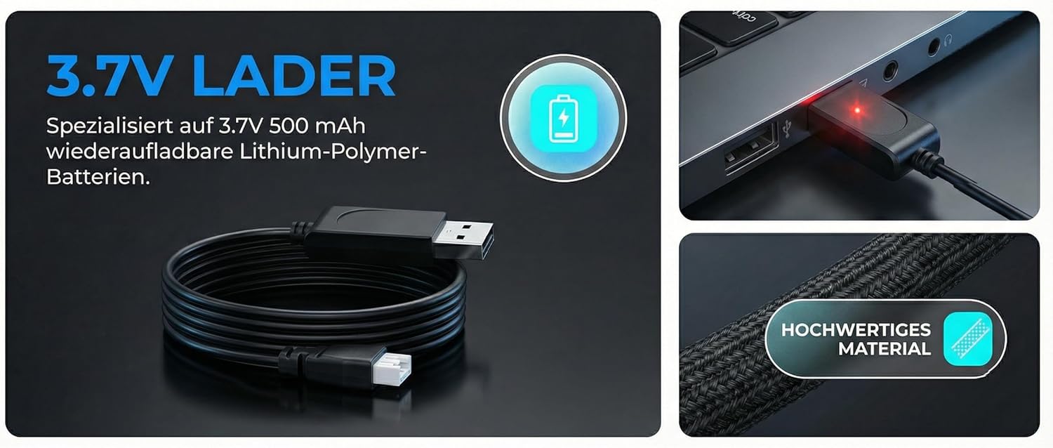 Das 3,7 V Lipo USB Ladegerät ist eine praktische Lösung für alle, die Ersatzteile für ihre UAV FPV Drohnen benötigen. Es ist speziell für 3,7 V Lipo-Akkus konzipiert und ermöglicht ein sicheres und schnelles Laden. Dieses Ladegerät ist ideal für Racing-Drohnen und sorgt dafür, dass Ihre Fluggeräte stets einsatzbereit sind.