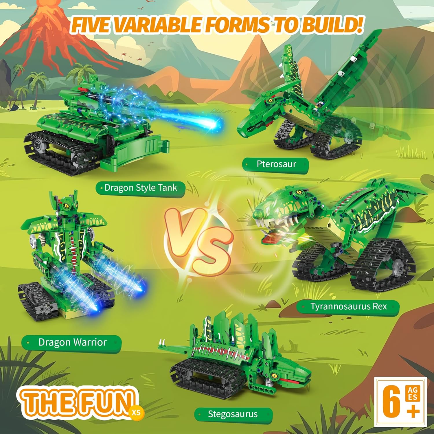 Mit dem Bausatz kann man verschiedene Roboter-Modelle, darunter Dinosaurier, bauen.