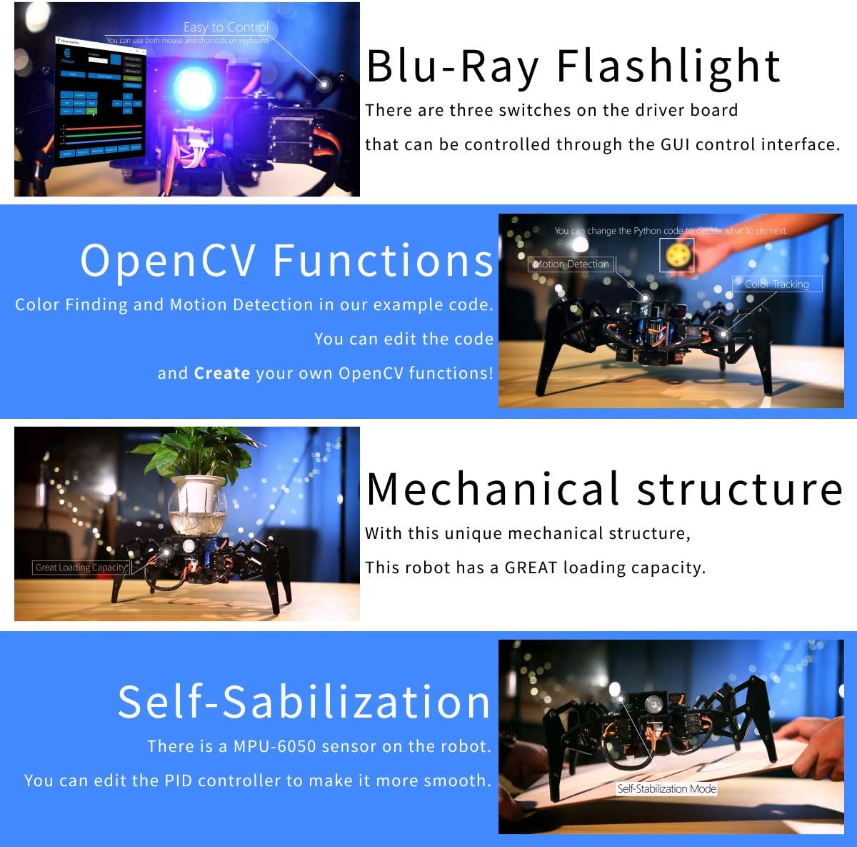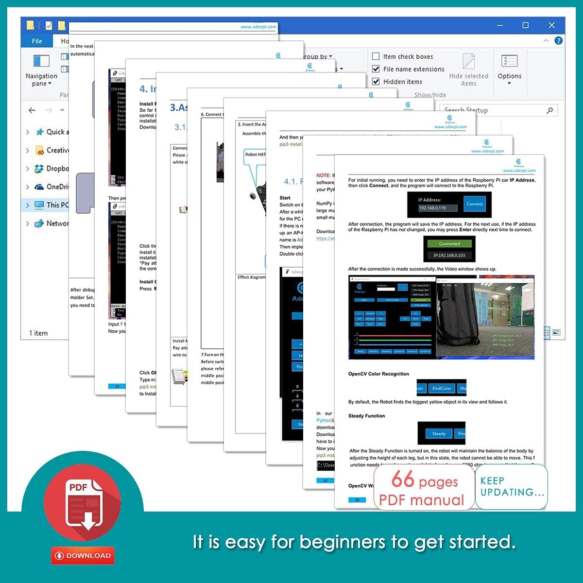 Der Adeept Spider Robot Quadruped Robot Kit ist ein innovatives Lernprojekt, das speziell für Raspberry Pi 4/3 Modell B+/B entwickelt wurde. Dieser Roboter bietet eine spannende Möglichkeit, sich mit Robotik und Programmierung auseinanderzusetzen. Mit Funktionen wie OpenCV Tracking und Selbststabilisierung mithilfe des MPU6050 Gyro Sensors ist er ideal für STEM-Projekte geeignet.