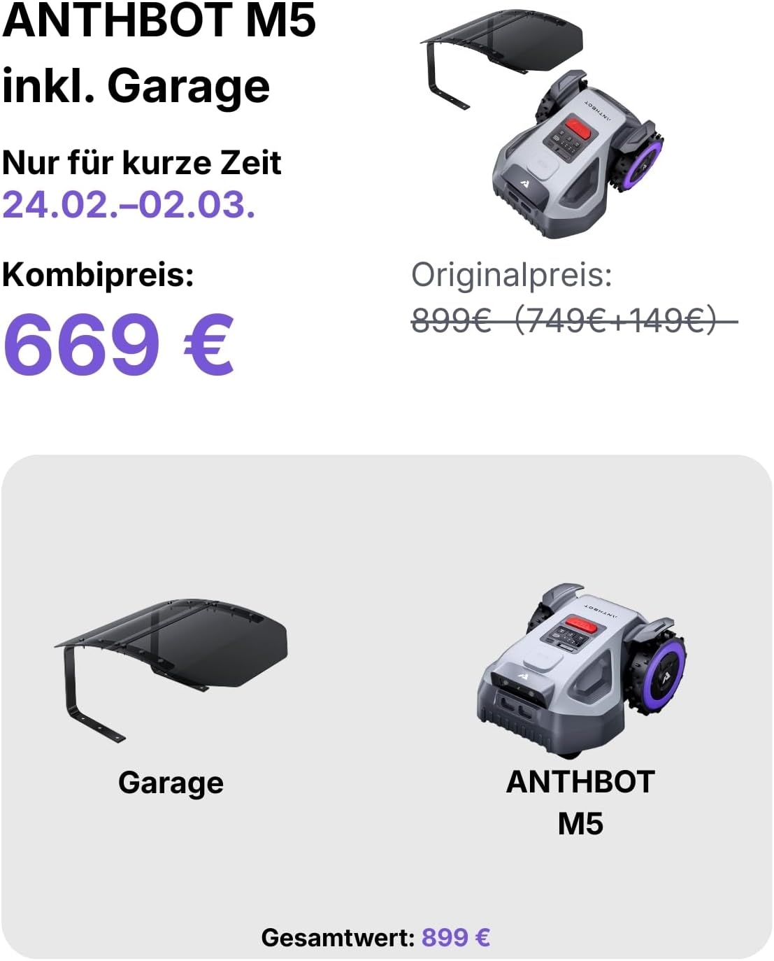 ANTHBOT M5 + Garage, Robotic Lawnmower without Boundary Cable with Precise RTK Navigation and Dual Vision, AI Obstacle Avoidance, App Control, 500 m², Compact Lawnmower Robot with 45% Incline