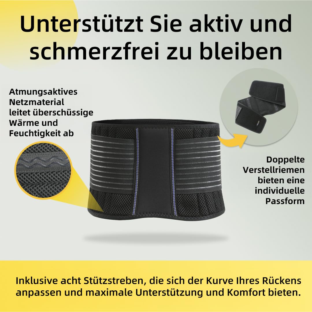 Der Rückenstützgurt verfügt über doppelseitige Klettverschlüsse, die eine individuelle Anpassung und einen bequemen Halt ermöglichen.