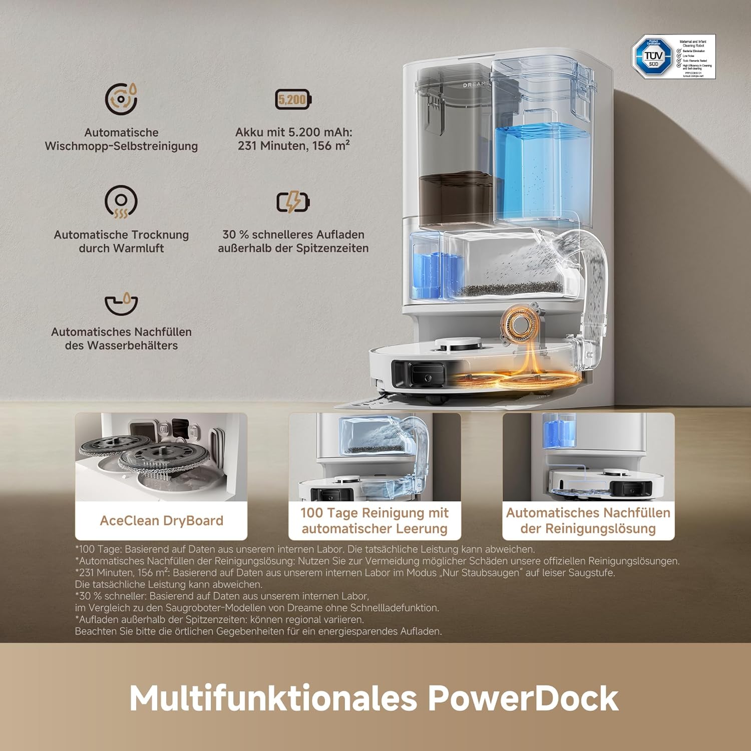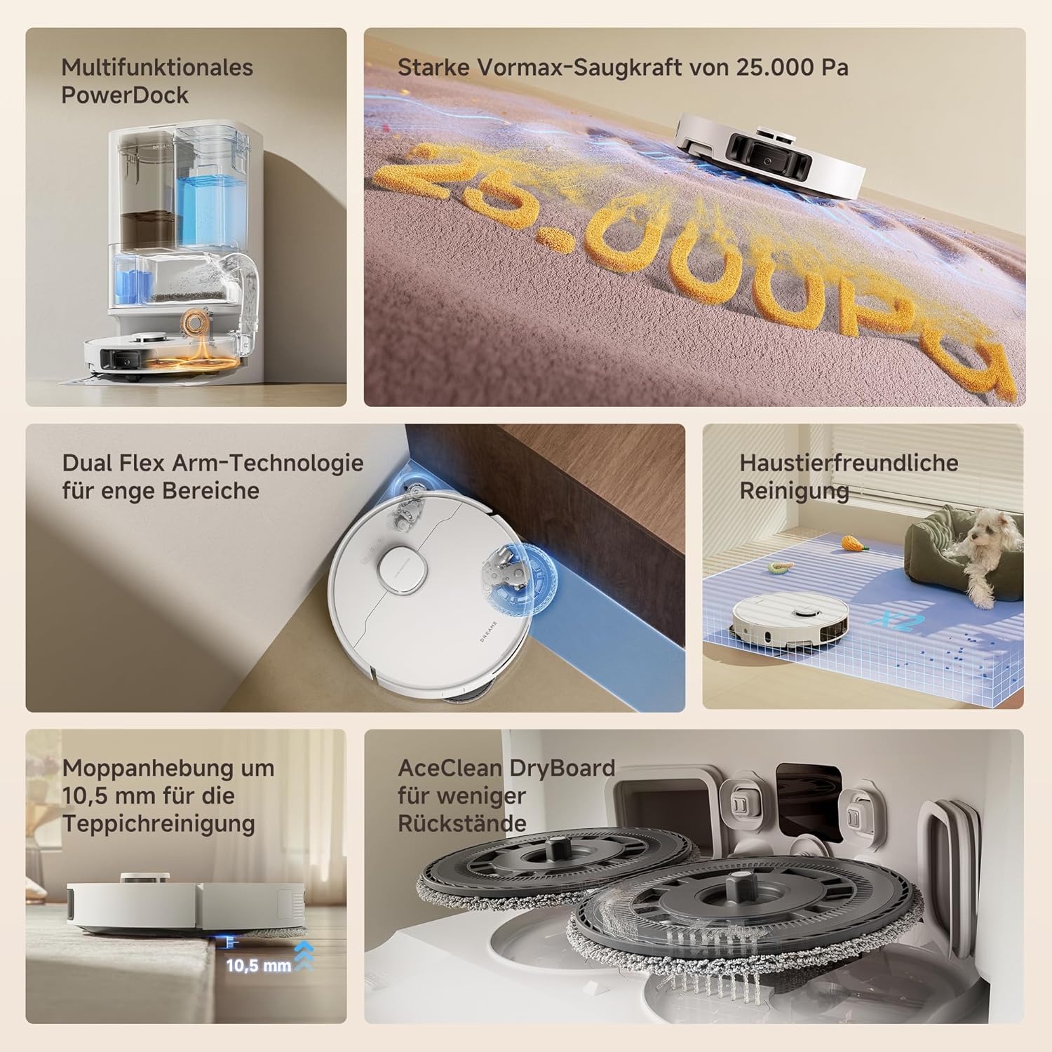 Der Dreame L10s Ultra Gen 3 Saug- und Wischroboter bietet eine beeindruckende Saugleistung von 25.000 Pa, die eine gründliche Reinigung verschiedener Oberflächen gewährleistet. Mit der ausziehbaren Seitenbürste und der Wischfunktion wird eine umfassende Reinigung ermöglicht. Die selbstreinigende All-in-One-Dockingstation sorgt dafür, dass der Roboter immer bereit für den nächsten Einsatz ist. Die App- und Sprachsteuerung bieten zusätzliche Flexibilität bei der Bedienung.