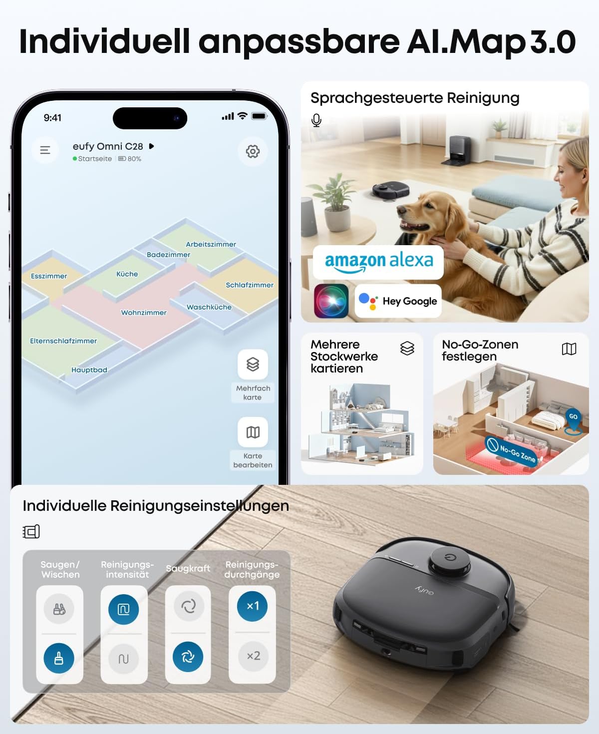 - Intelligente Hinderniserkennung für ungestörtes Reinigen