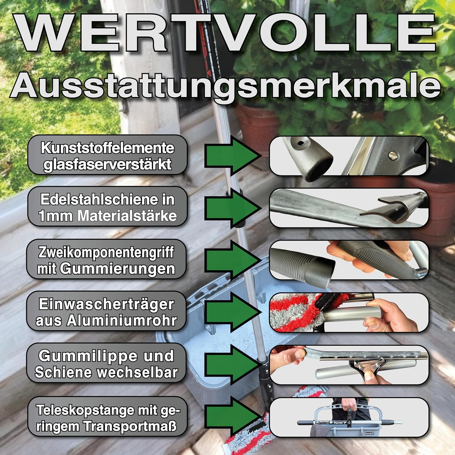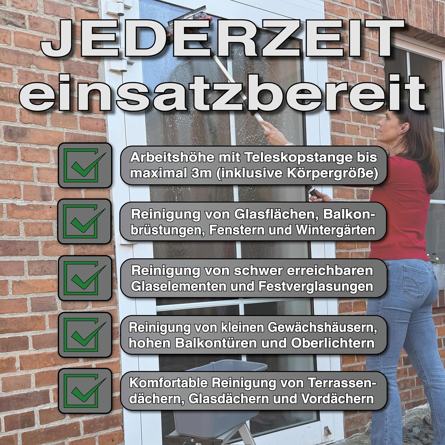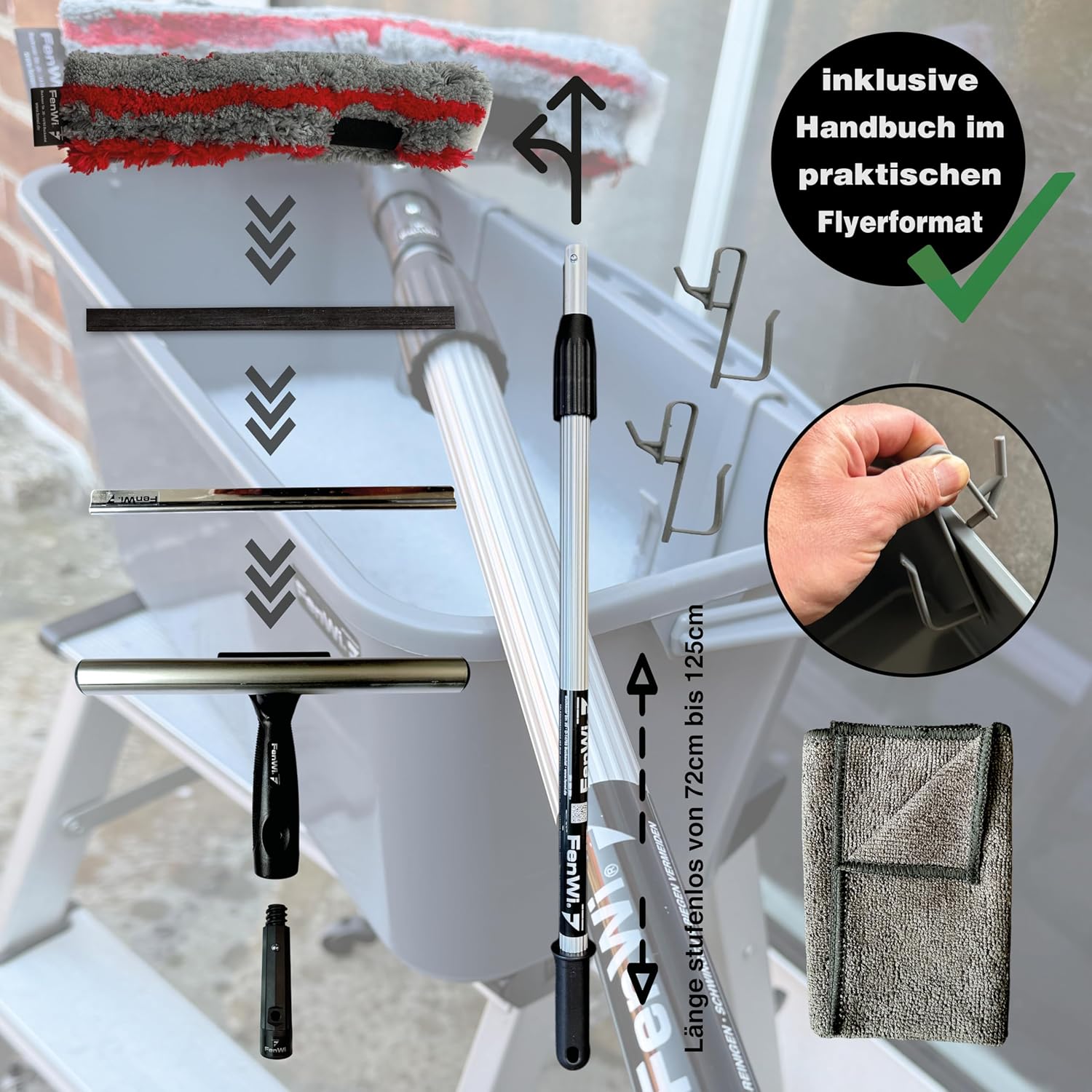 Das FenWi 1.25 m Professional Complete Set bietet eine umfassende Lösung für die Reinigung von Glas, Fenstern und Wintergärten. Mit diesem 10-teiligen Set sind Sie bestens ausgestattet, um effektive Reinigungsarbeiten durchzuführen. Es eignet sich nicht nur für Fenster, sondern auch für Duschkabinen, Glasgeländer, Gewächshäuser und sogar landwirtschaftliche Maschinen. Die Teleskopstange ermöglicht eine bequeme Nutzung ohne gefährliches Stehen auf Leitern.