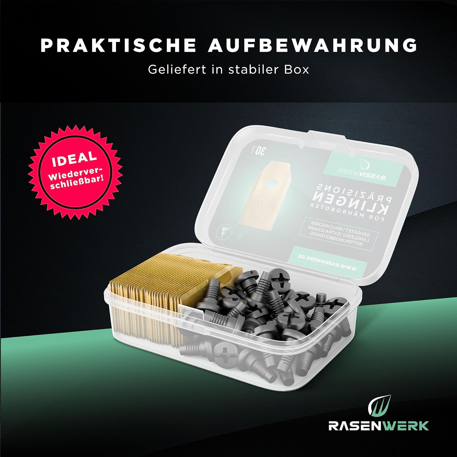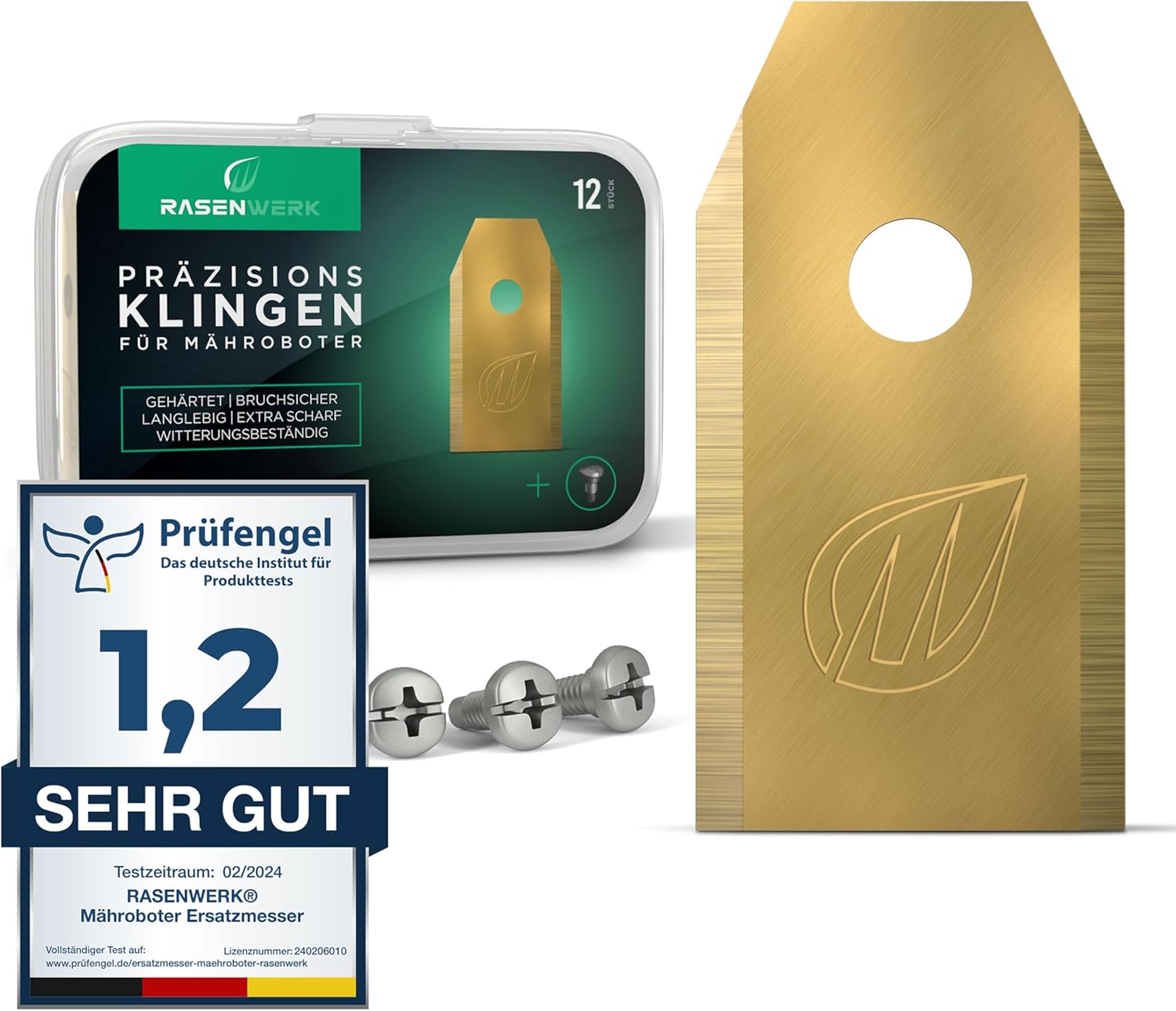 Hochwertige Ersatzmesser für Mähroboter – Kompatibel mit Husqvarna, Gardena, Yard Force mit innovativen Schrauben – Universelle Ersatzmesser – Rasenroboter-Messerset – 12-teilig.