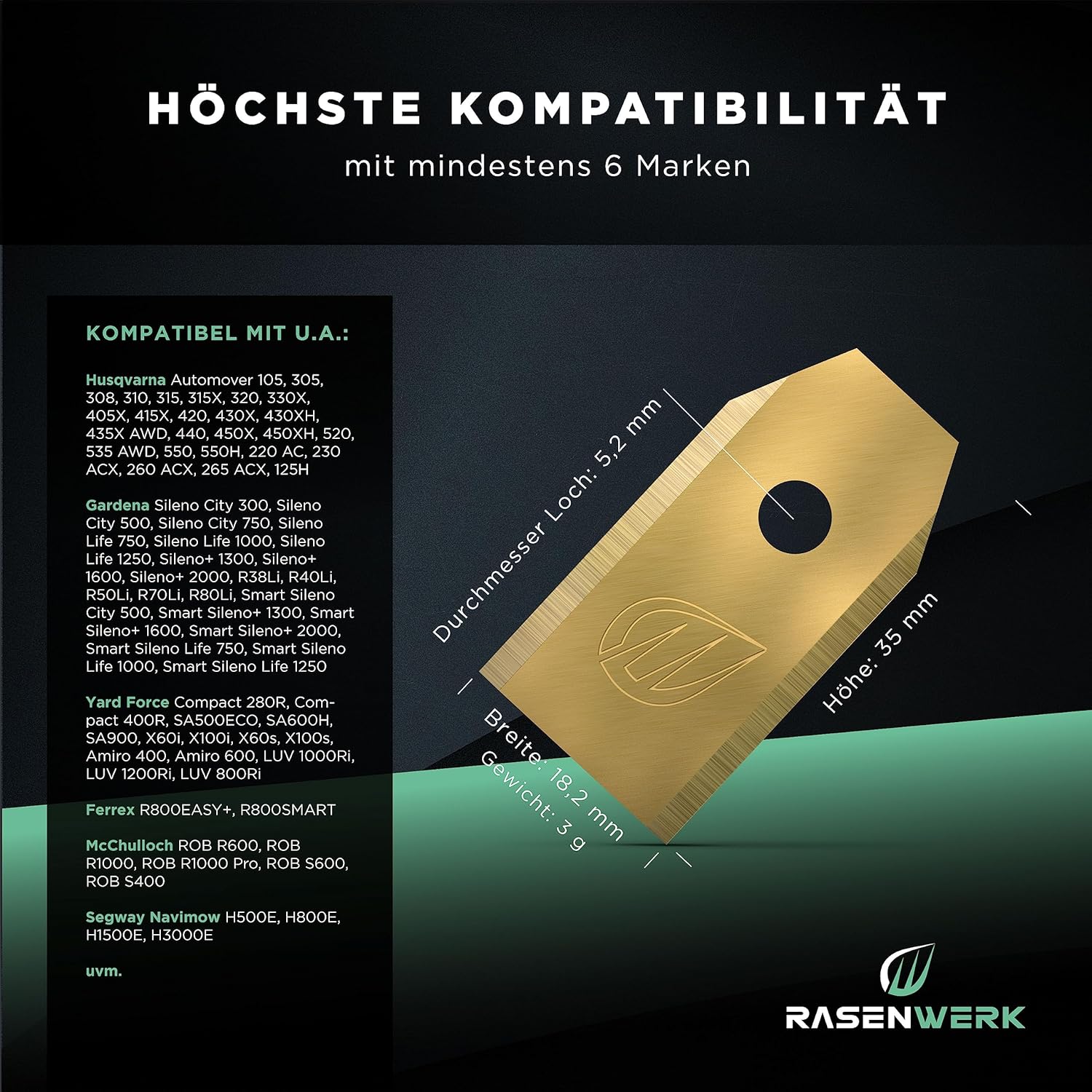 Die hochwertigen Ersatzmesser für Mähroboter sind eine ausgezeichnete Wahl für alle, die ihre Rasenroboter optimal warten möchten. Diese universellen Ersatzmesser sind kompatibel mit verschiedenen Marken wie Husqvarna, Gardena und Yard Force. Die innovative Schraubentechnologie sorgt für eine einfache Montage und eine zuverlässige Befestigung der Messer.