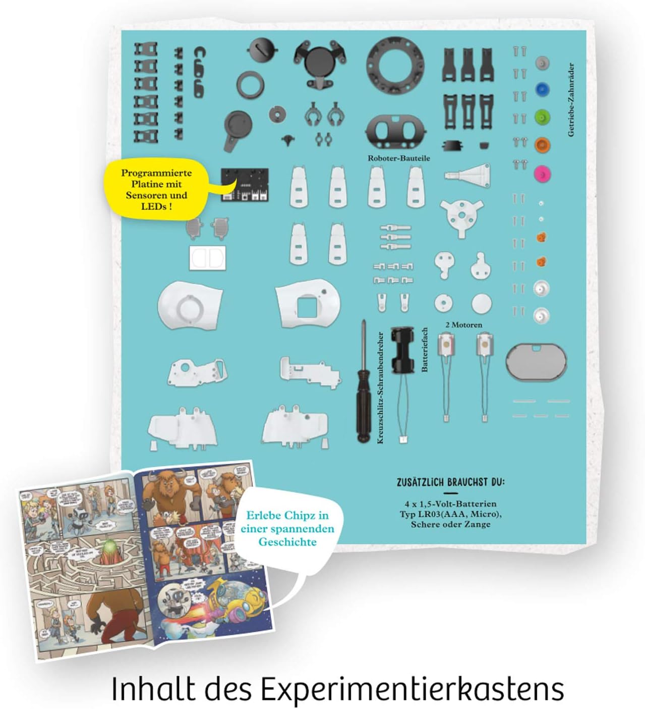 Entdecken Sie die Kosmos 3-in-1-Roboter-Spielzeug-Experimentierbox, die speziell für junge Technikbegeisterte im Alter von 8 bis 14 Jahren entwickelt wurde. Mit über 100 Bauteilen können Kinder ihren eigenen Roboter, Chipz, zusammenbauen. Chipz ist ein intelligenter Roboter mit sechs Beinen, der verschiedene Sensoren und Spielmodi nutzt, um Objekte zu erkennen und Hindernissen auszuweichen. Die Box enthält alles, was benötigt wird, um mit dem Bau zu beginnen, einschließlich einer vorprogrammierten Platine und einer Anleitung.