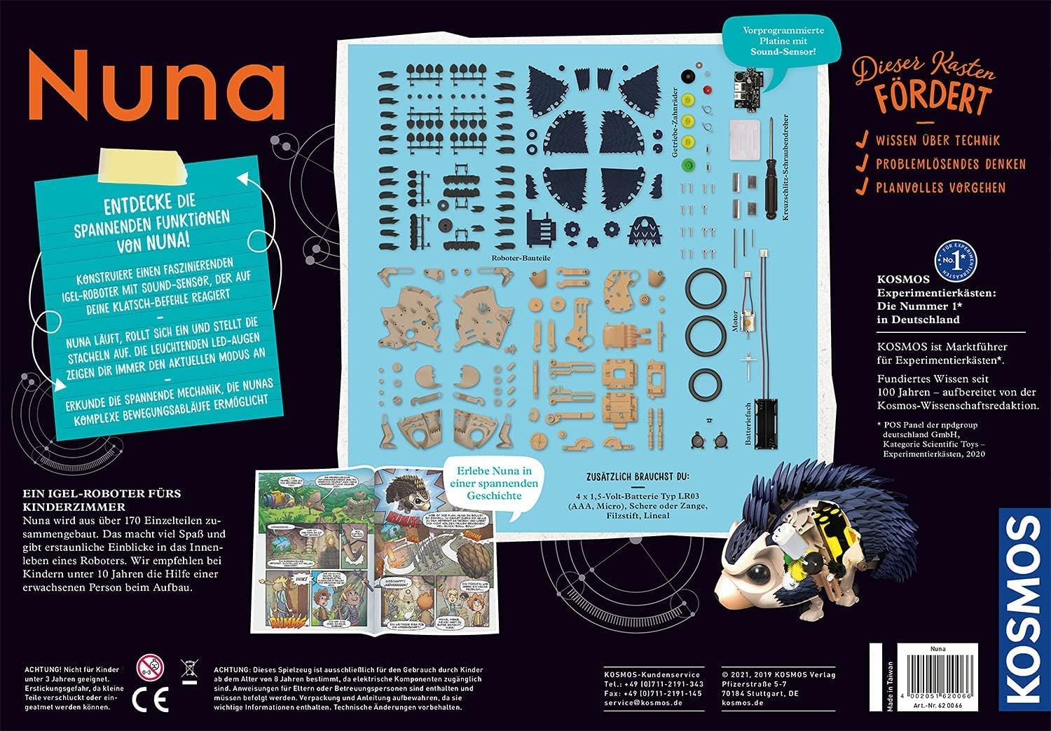 Der Kosmos 620066 Nuna – My Robotic Pet ist ein faszinierender Experimentierkasten, der Kinder im Alter von 8 bis 12 Jahren in die Welt der Robotik einführt. Mit diesem Bausatz können Kinder einen niedlichen Igel-Roboter konstruieren, der auf Klatschbefehle reagiert. Der integrierte Sound-Sensor ermöglicht es dem Igel, rückwärts zu rollen, sich zusammenzurollen und seine Stacheln aufzustellen, was für viel Spaß und Staunen sorgt.