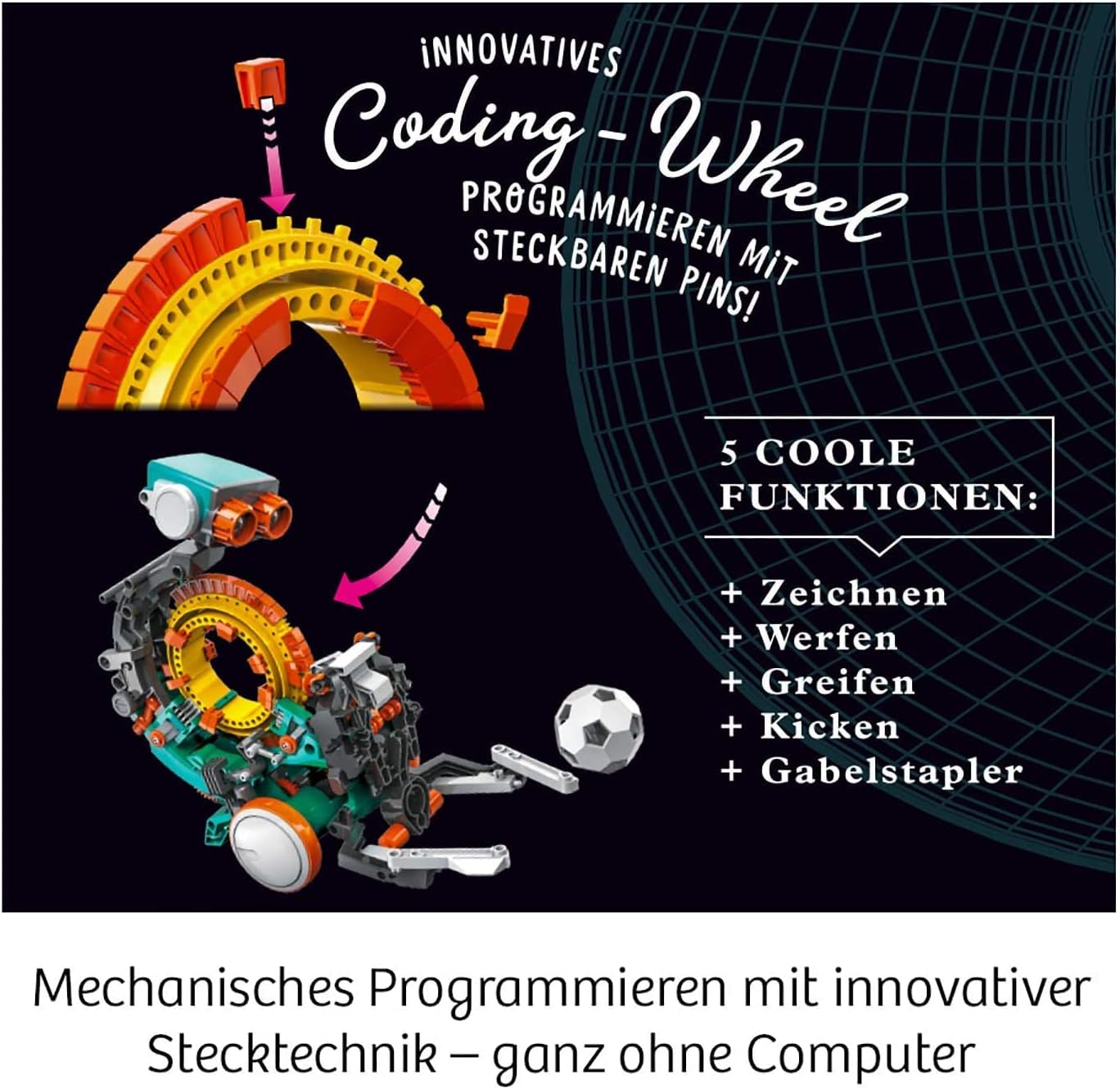 Entdecken Sie die faszinierende Welt der Robotik mit dem Kosmos Codix-Dein Mechanischer Codierroboter! Dieses Experimentierset richtet sich an Kinder im Alter von 8 bis 14 Jahren und bietet eine spannende Einführung in das mechanische Programmieren. Die Kinder können die Bewegungen des Roboters selbst steuern, indem sie die kleinen Pins auf das Coding-Wheel stecken und so verschiedene Funktionen aktivieren.