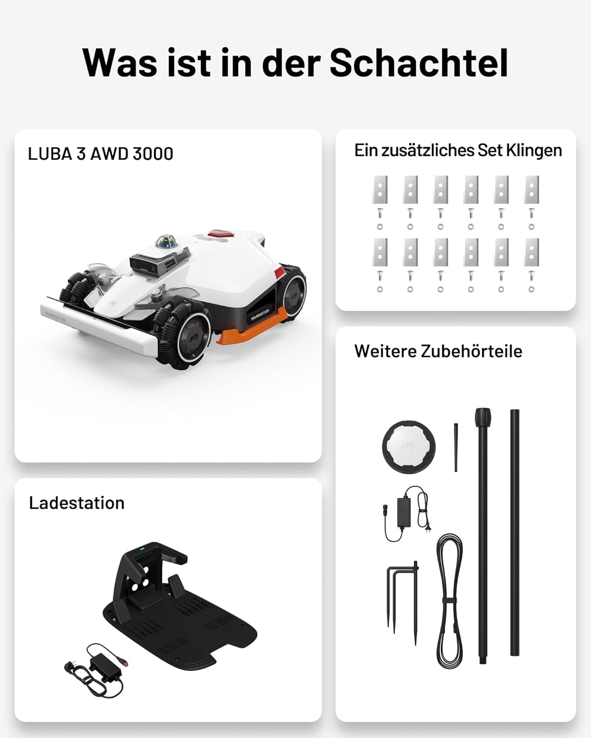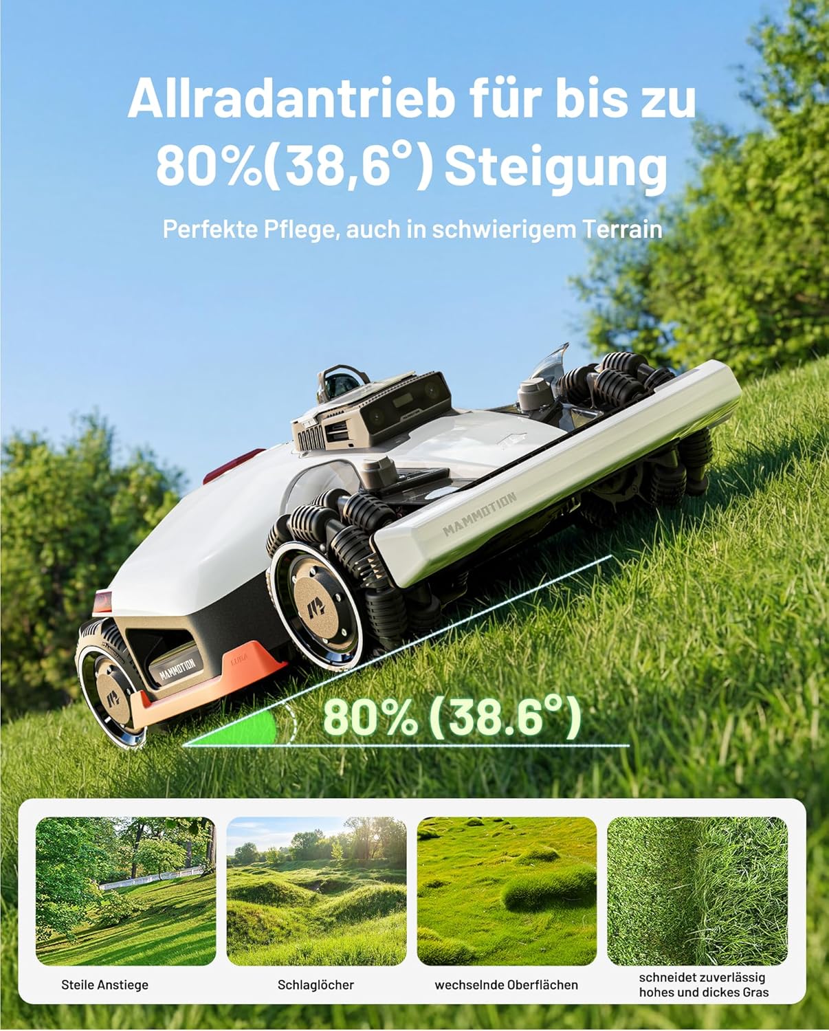 Der MAMMOTION LUBA 3 AWD 3000 Roboter-Rasenmäher bietet eine innovative Lösung für die Pflege Ihres Gartens. Mit einer Reichweite von bis zu 3000 m² und der Fähigkeit, 80 % Steigungen zu bewältigen, ist er ideal für große und anspruchsvolle Rasenflächen. Die 360° LiDAR-Technologie ermöglicht eine präzise Kartierung und Navigation, während die NetRTK+KI Vision Tri-Fusion-Positionierung für eine effiziente Mähleistung sorgt.
