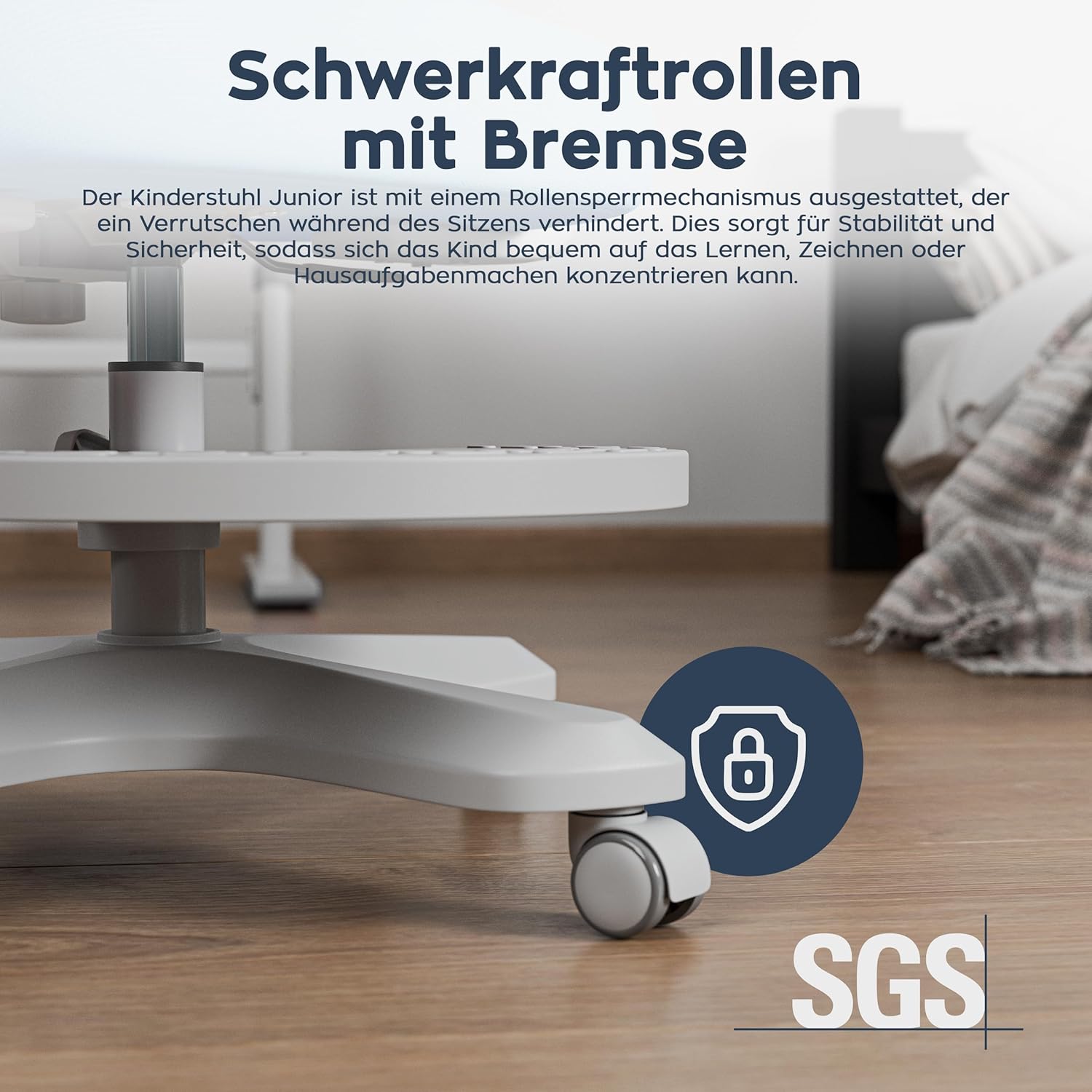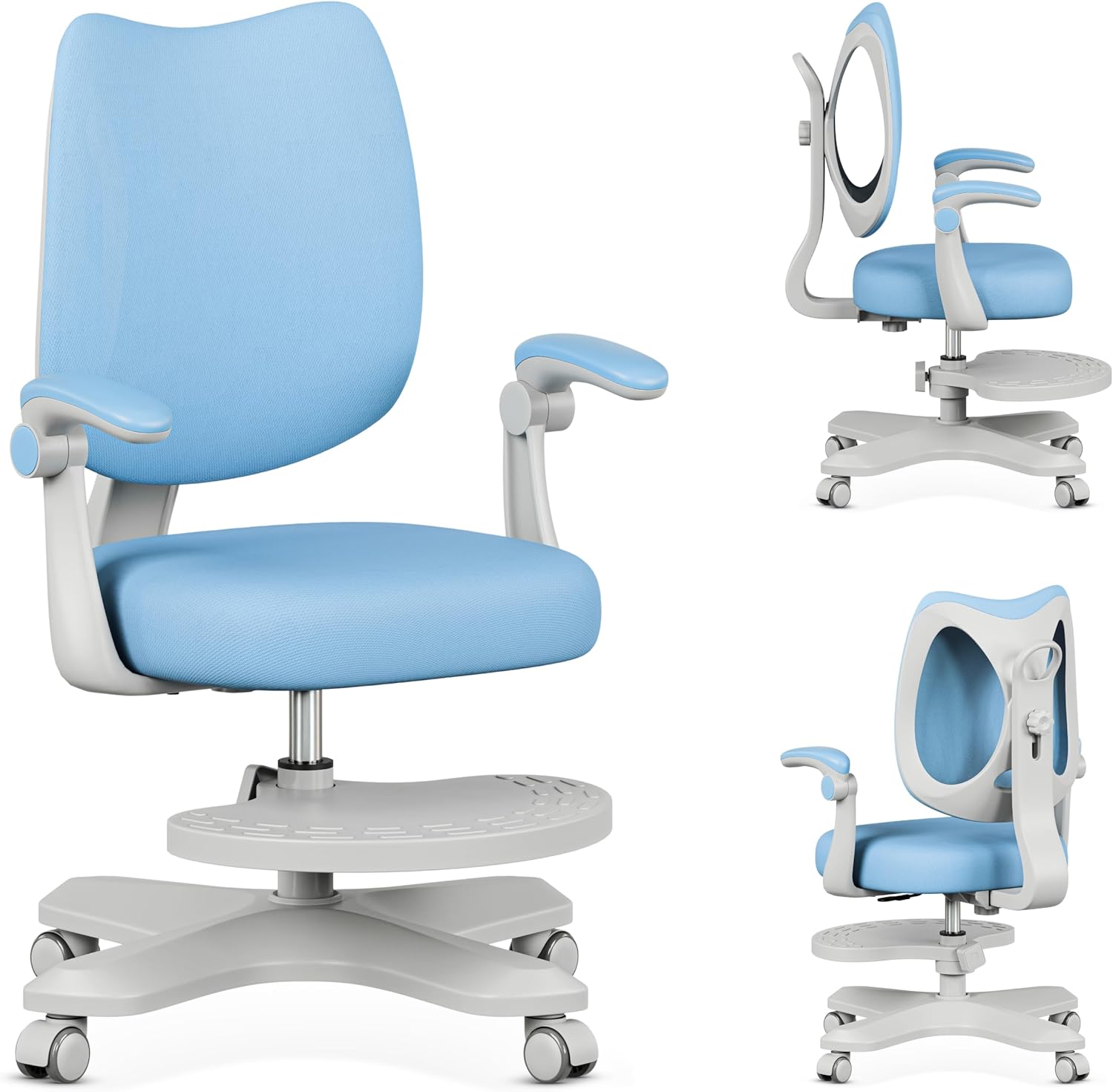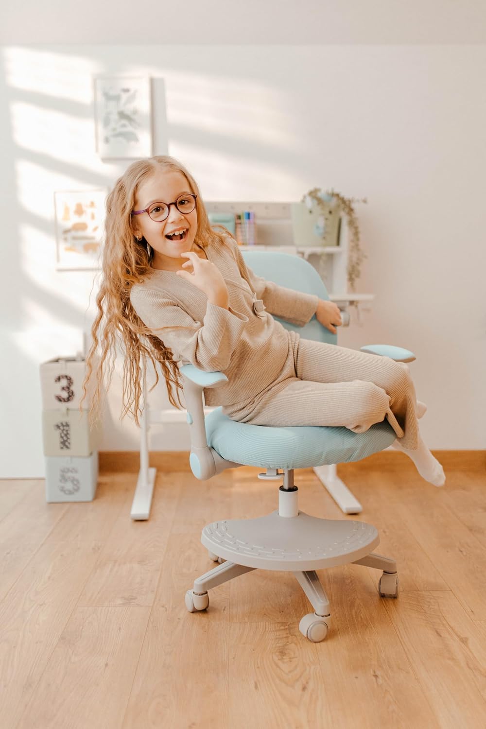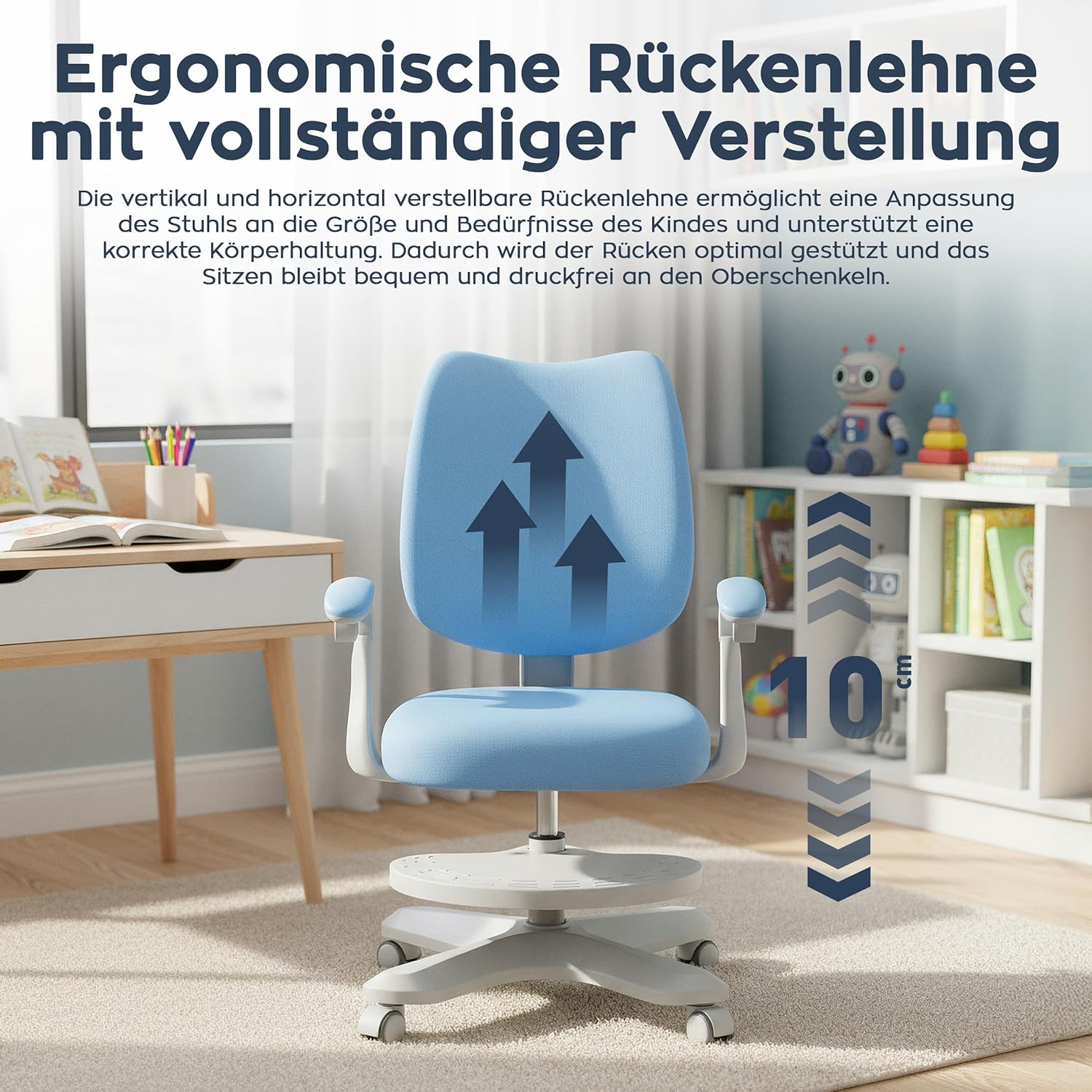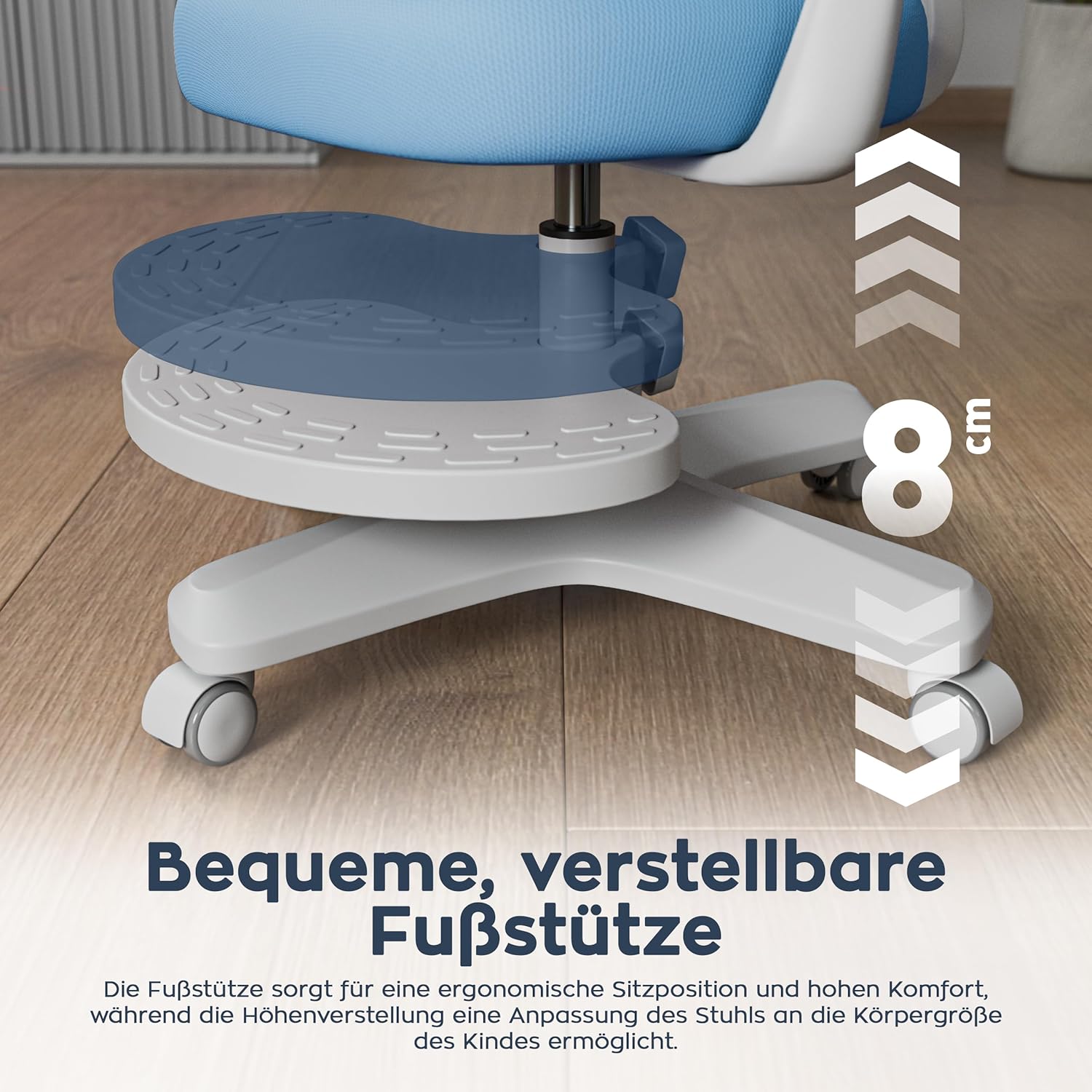 Zusätzlich verfügt der Stuhl über eine Fußstütze, die das Sitzen für längere Zeit angenehmer macht. Der blaue Farbton sorgt für eine ansprechende Optik im Kinderzimmer.