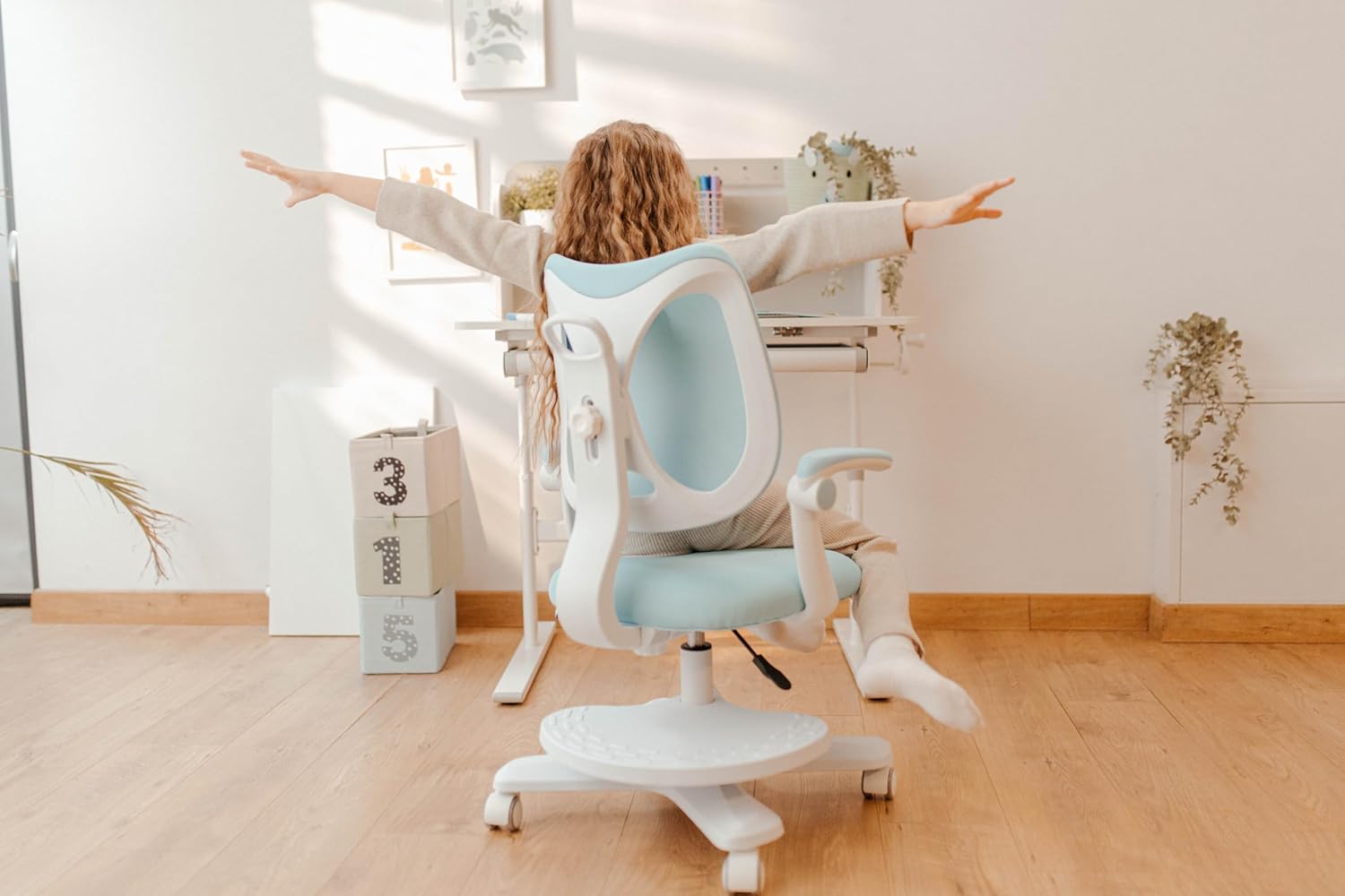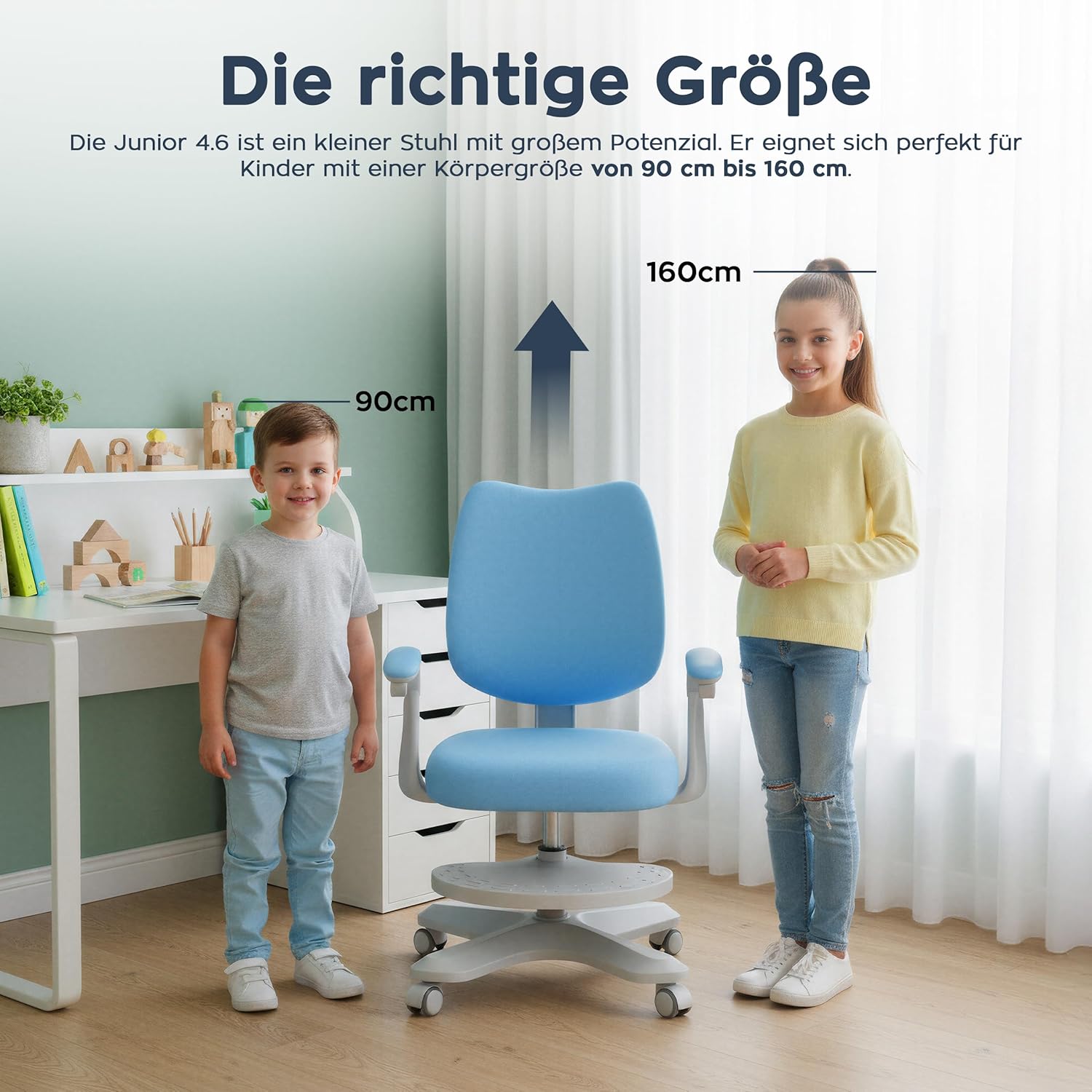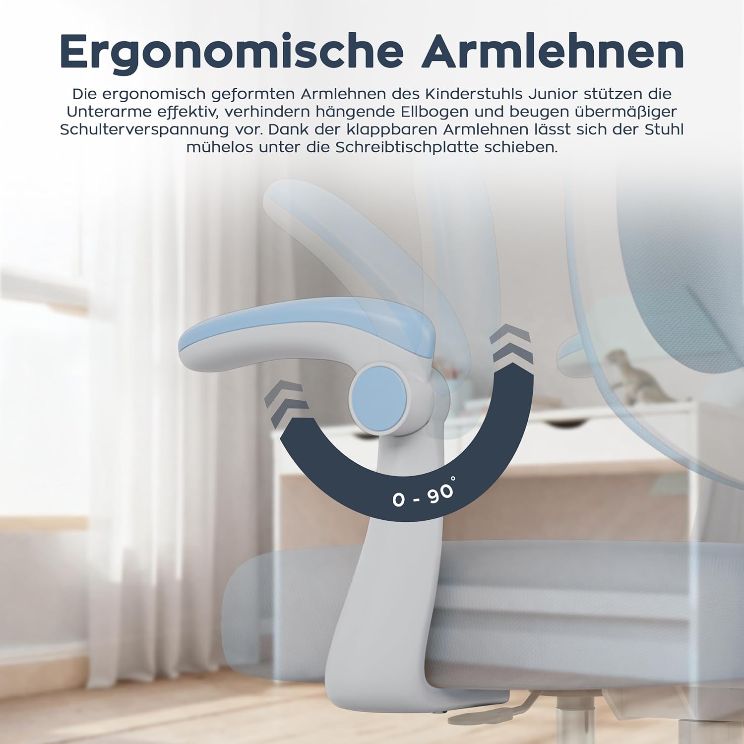 MARK ADLER Junior 4.6 Ergonomischer Kinder-Schreibtischstuhl, Drehstuhl, höhenverstellbare Rückenlehne, verstellbare 360°-Drehung, klappbare Armlehnen, Schwerkrafträder, Fußstütze, blau