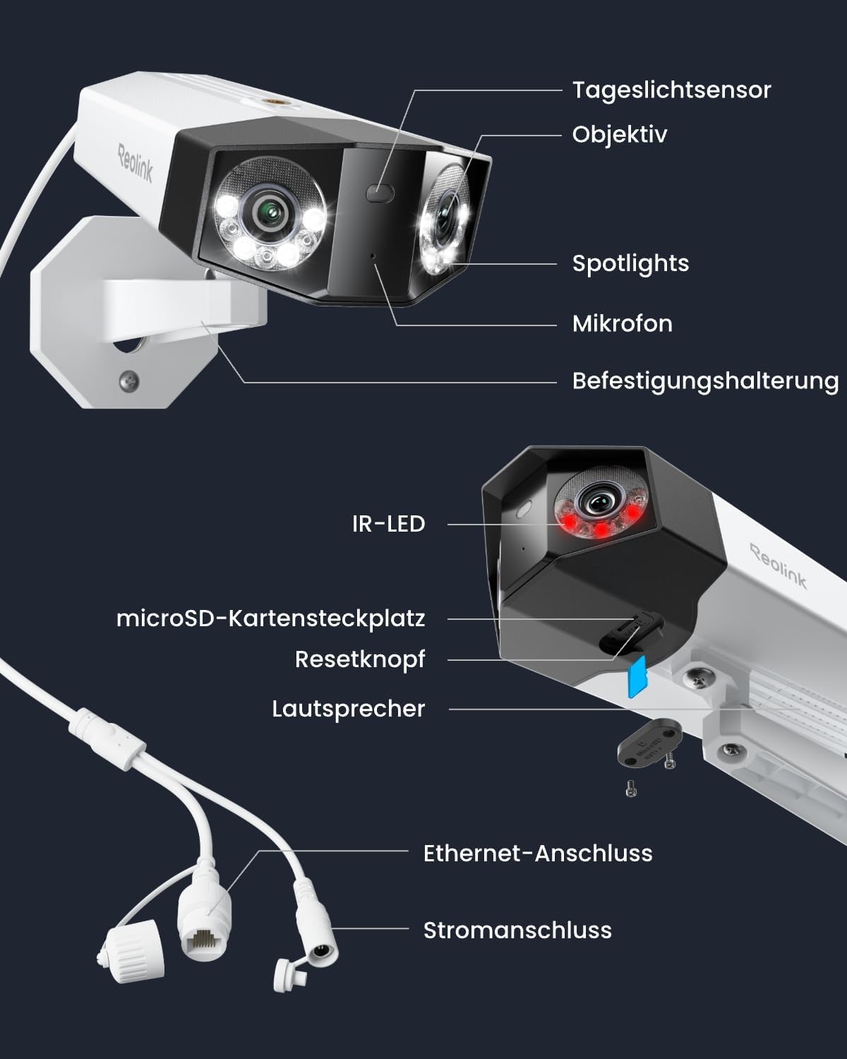 Die Reolink 16MP UHD Dual Lens PoE Outdoor-Überwachungskamera bietet eine beeindruckende 180°-Panoramablick und ist ideal für die Überwachung großer Bereiche. Mit Funktionen wie Bewegungsverfolgung und Farbnachtsicht sorgt sie dafür, dass Sie auch bei Dunkelheit klare Bilder erhalten. Die Kamera erkennt Personen, Fahrzeuge und Tiere, was die Überwachung effizienter macht.