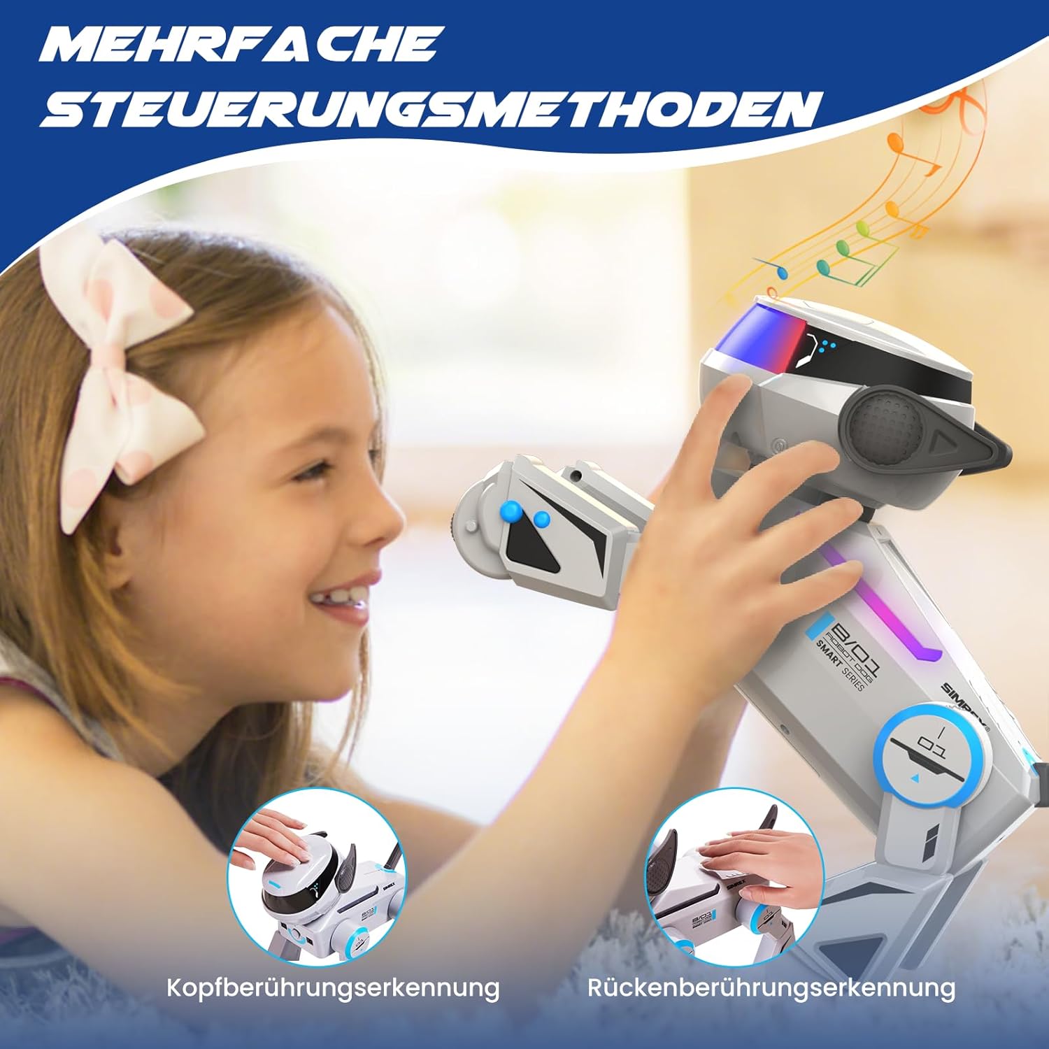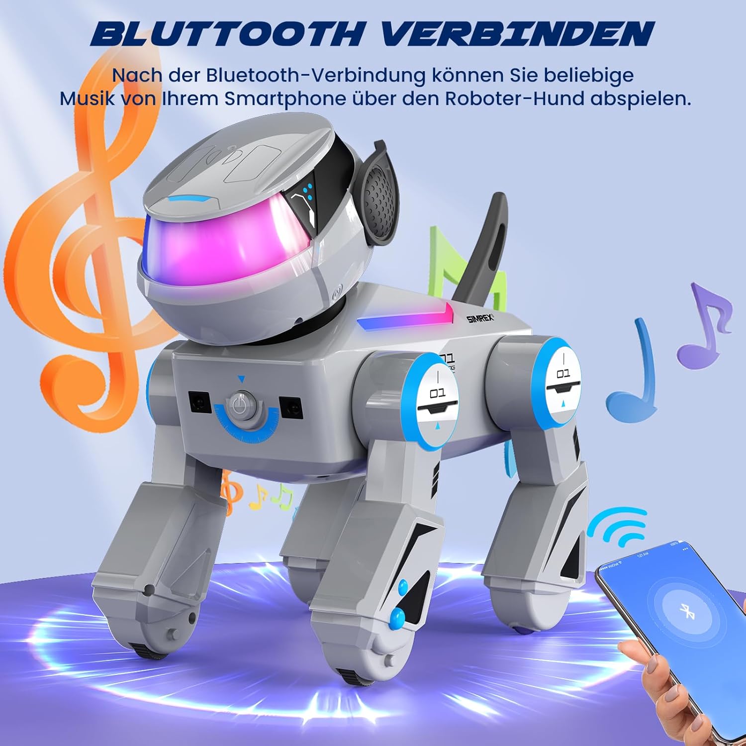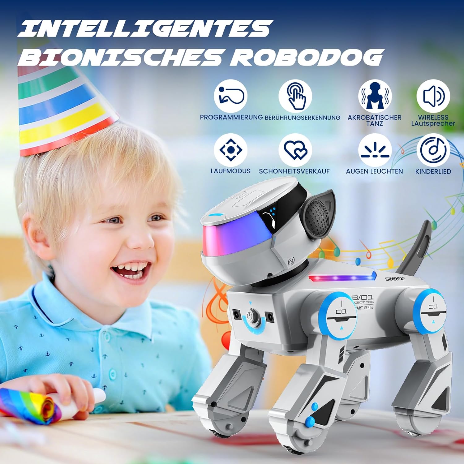 Der SIMREX Roboterhund ist ein interaktives Spielzeug, das speziell für Kinder entwickelt wurde. Mit seinem Berührungssensor reagiert der Roboterhund auf verschiedene Berührungen und sorgt so für ein unterhaltsames Spielerlebnis. Die Bluetooth-Fernbedienung ermöglicht eine einfache Steuerung und bietet zahlreiche Tanztricks, die das Interesse der Kinder wecken. Die LED-Augen verleihen dem Roboterhund ein lebendiges Aussehen und machen ihn zu einem attraktiven Spielgefährten.