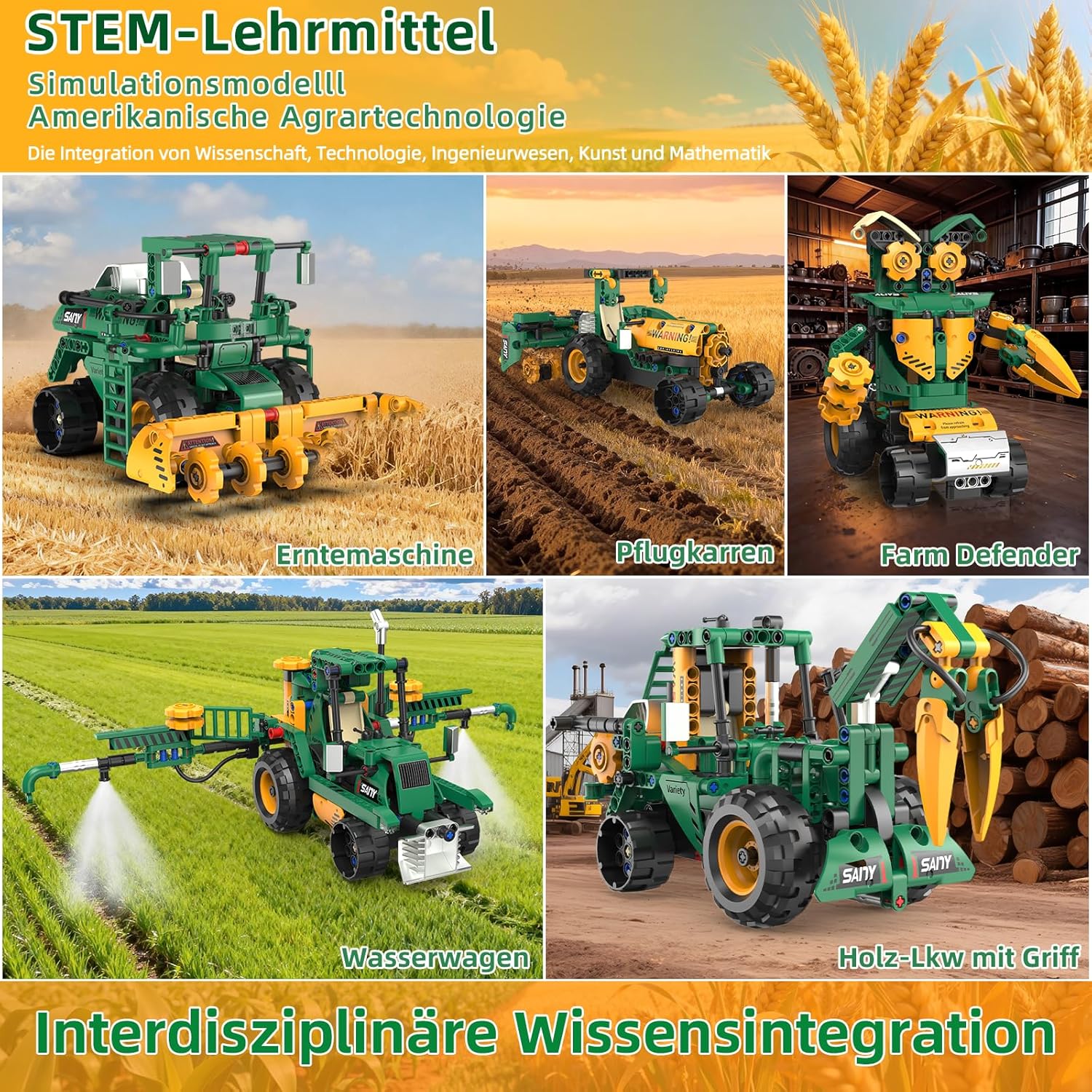 Mit dem 5-in-1-Roboterset können Kinder einen Mähdrescher, einen Traktor, einen Wasserwagen und weitere Modelle bauen.