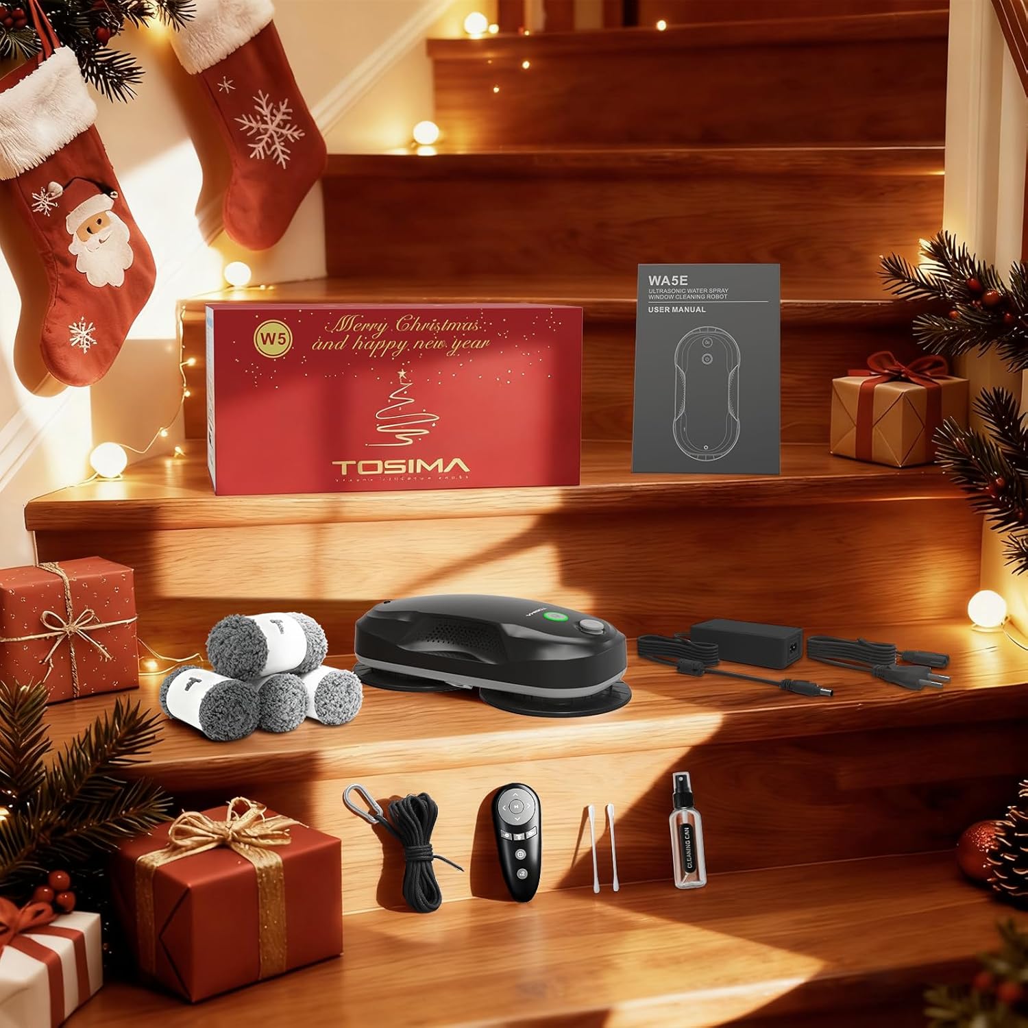 Tosima Fensterputzroboter mit bidirektionalem Ultraschall-Zerstäubungswasserstrahl und 85 ml Wassertank, Fensterroboter mit starker Saugkraft für gründliche Fensterreinigung, aktualisiert (schwarz)