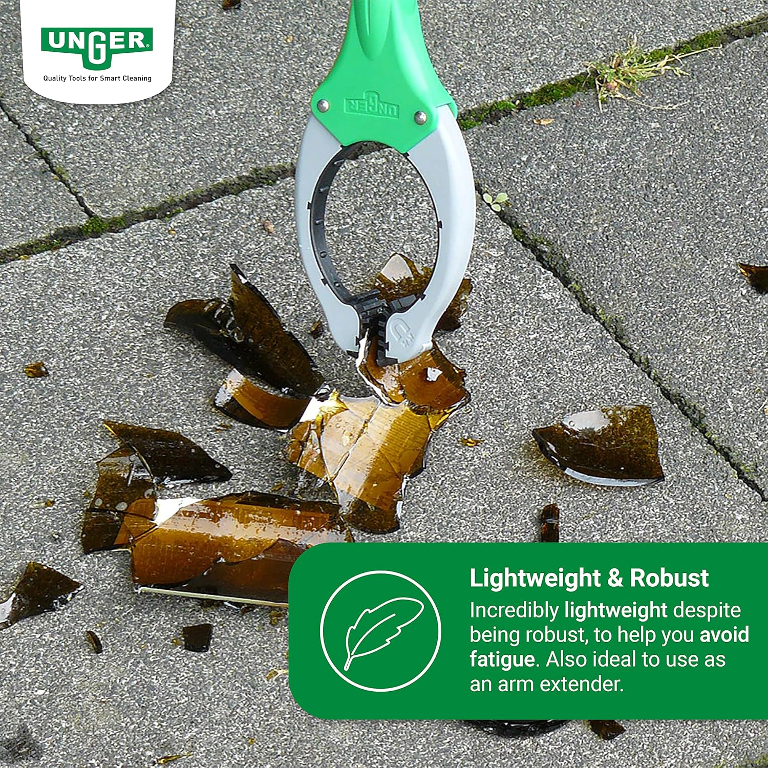 Der Unger Nifty Nabber® Trigger Grip ist ein vielseitiger Allzweckgreifer mit einer Länge von 90 cm. Er wurde entwickelt, um Ihnen das Aufheben von Abfällen und anderen Gegenständen zu erleichtern, ohne dass Sie sich bücken oder strecken müssen. Der robuste Abfallgreifer verfügt über eine stabile Innenführungsstange, die dafür sorgt, dass er immer in Form bleibt und nicht bricht. Die Mechanik ist direkt ansprechend, was maximalen Arbeitskomfort bietet.