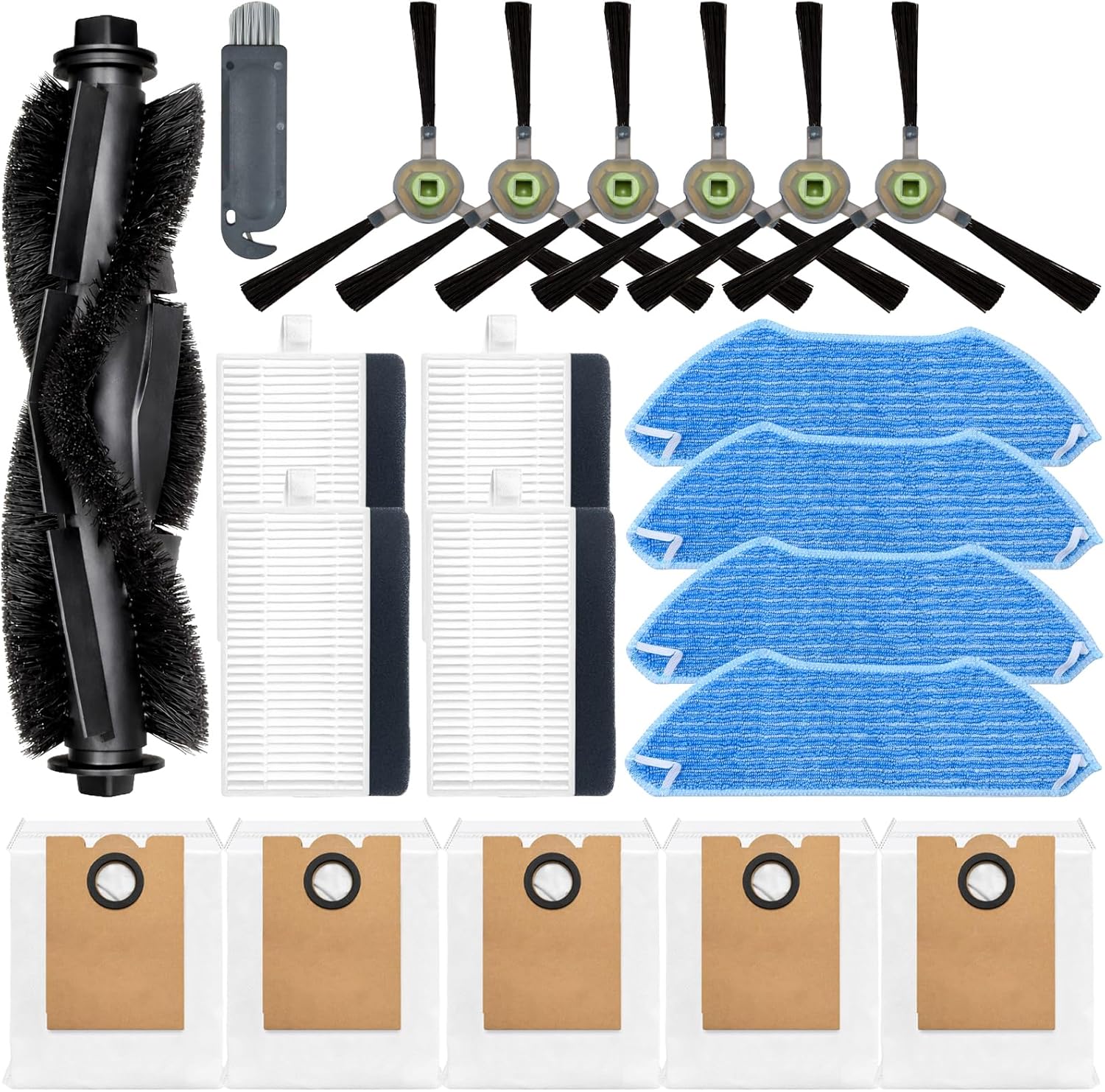 [Package Includes] –1 x Main Roller Brush,6 x Side Brushes,4 x HEPA Filters,4 x Mop Pads,5 x Dust Bags,1 Small Brush.