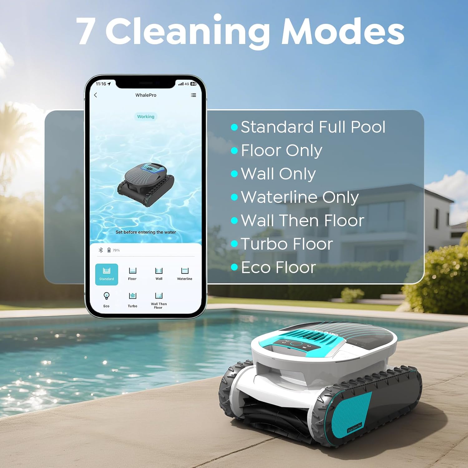7-Mode Adaptive Cleaning System: Equipped with 7 intelligent modes — Full Pool, Floor Only, Wall Only, Waterline, Wall & Floor, Turbo Floor, and Eco Mode — allowing flexible cleaning strategies for different pool conditions.
