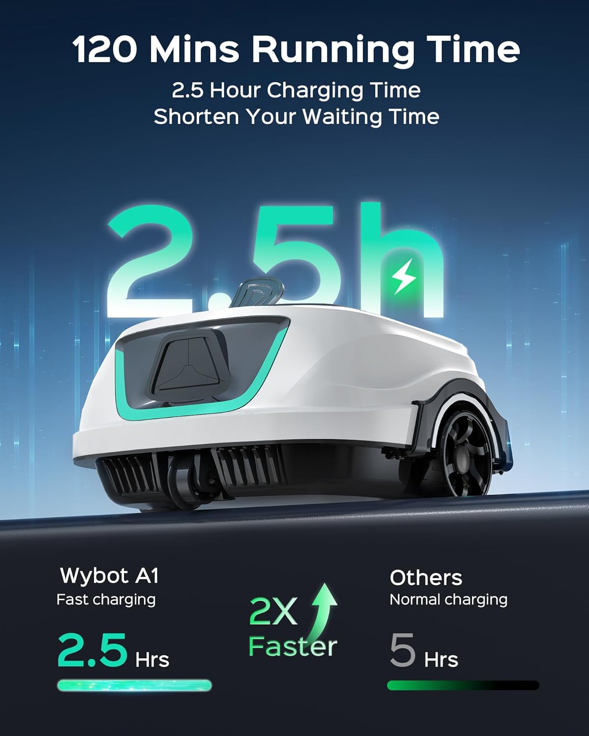 It takes approximately 2.5 hours to fully charge the WYBOT A1.