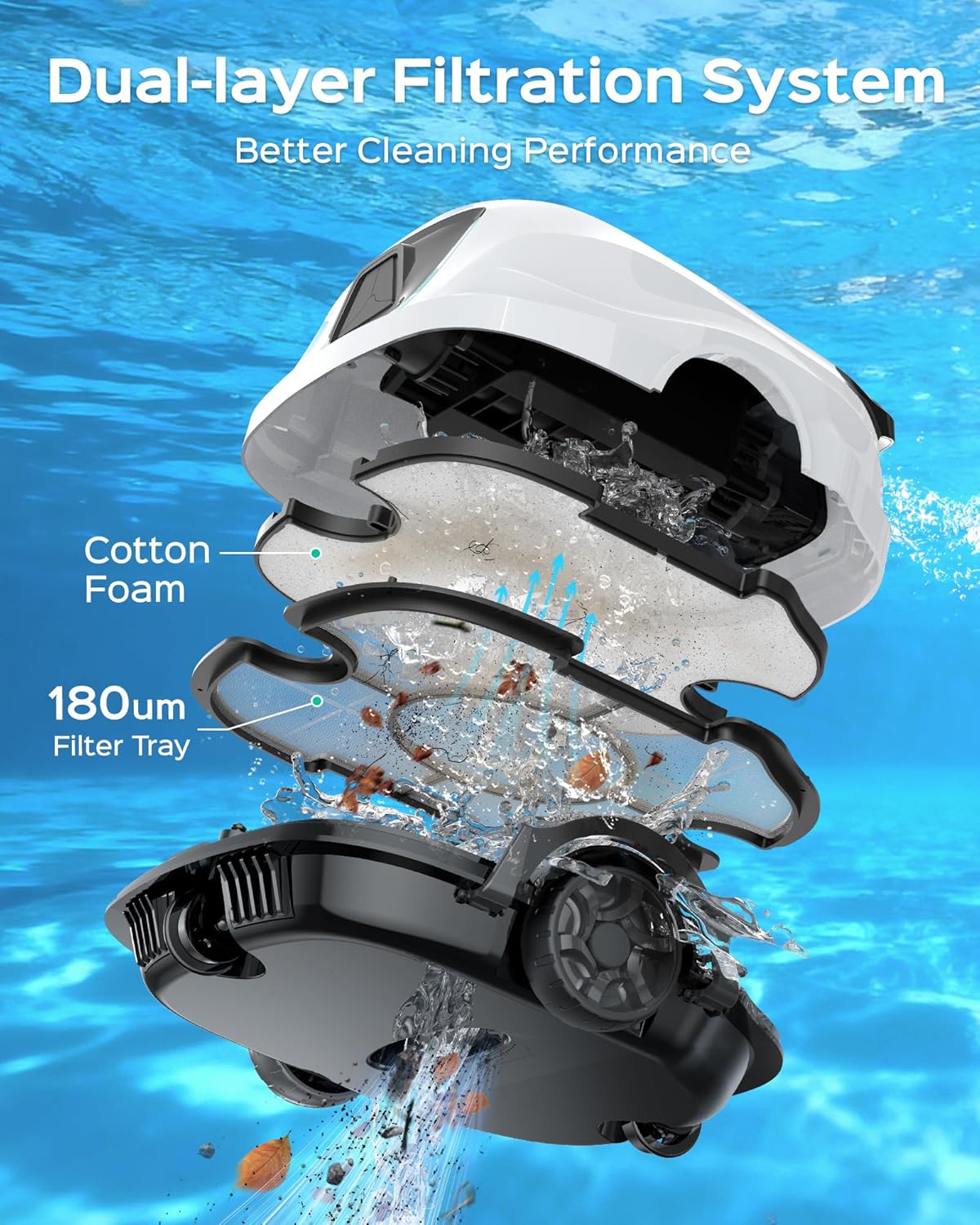 Exceptional Dual-Layer Filtration System:This above ground pool vacuum features a rare dual-layer filtration system, combining a 180μm filter with a textured foam layer to enhance filtration efficiency by 50%—setting it apart from conventional pool vacuum robot.This pool cleaner effectively captures various debris, including fine leaves, sand, and more, ensuring superior pool cleanliness.Note: For heavily soiled pools, clean the filter every 30 minutes to prevent clogging and potential damage.