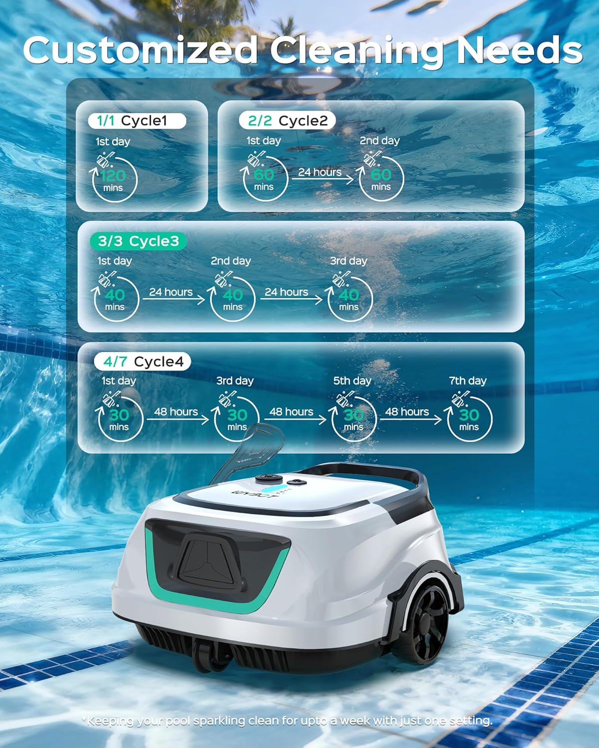4 Selectable Cleaning Cycles: Introducing the latest feature for WYBOT in 2025! Alongside its powerful suction capabilities, it offers four cleaning cycle modes to meet your cleaning needs for up to seven days. Simply follow the cycle setup instructions in the manual, and you’ll always have a sparkling clean pool.