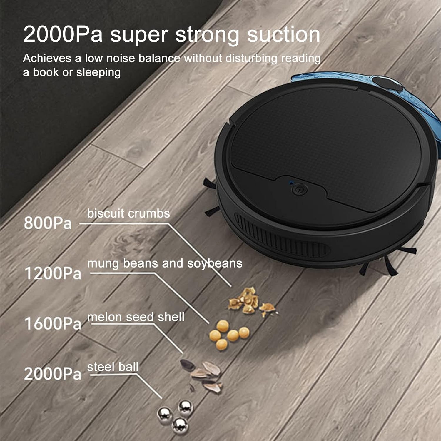 1. 2000Pa Strong Suction: The 2000Pa super strong suction can easily remove stains on the ground. It also achieves a low noise balance without disturbing reading a book or sleeping. Built in visual sensor gives it a slimmer body, and it can freely access to the bottom of the bed, sofa, cabinet, etc.