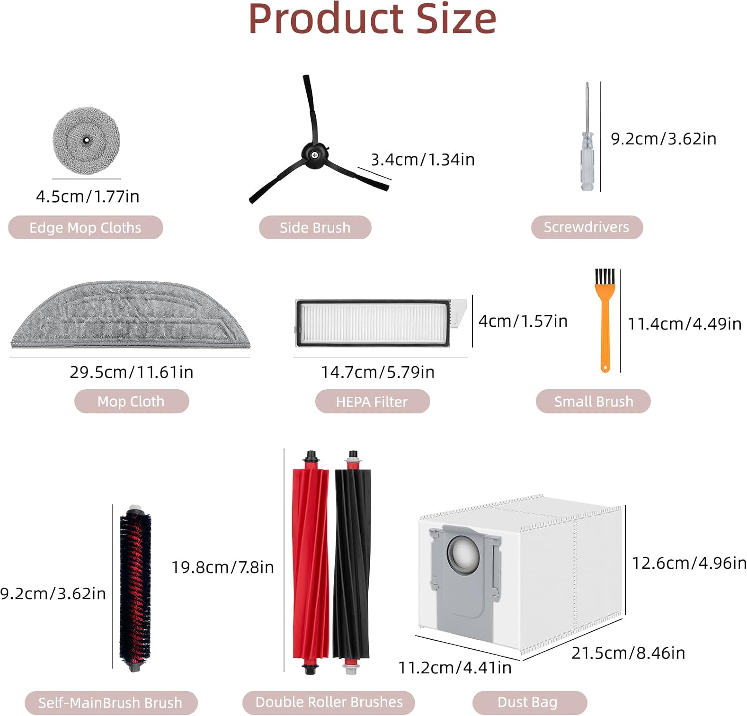 The pack includes main brushes, dust bags, mop cloths, edge mop cloths, filters, side brushes, a self-main brush, a cleaning brush, and a screwdriver.