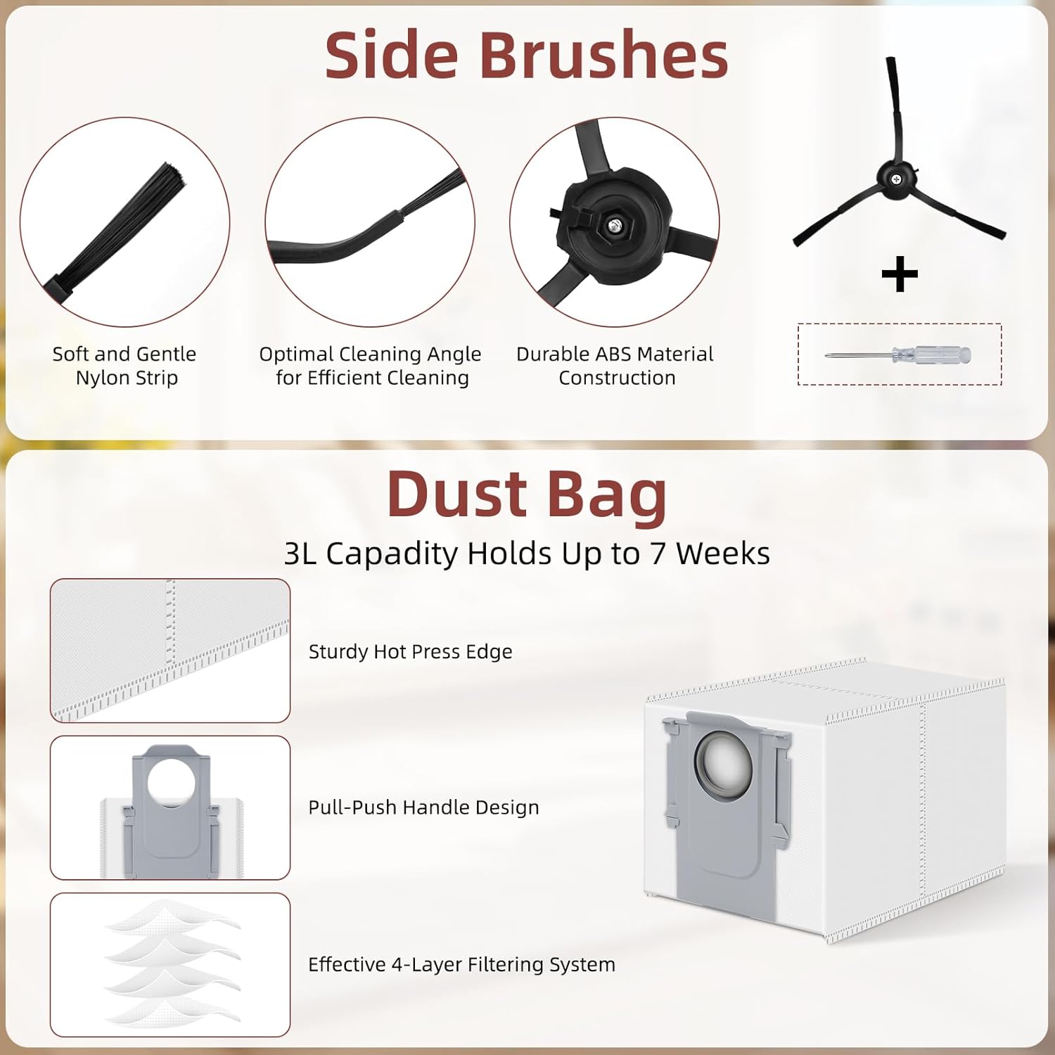 Dust Bag/Filter: Vacuum dust bag is made of 2 layers of non-woven fabric and 2 layers of melt-blown fiber,which can block particles such as dust,pet hair,etc;each can store up to 7 weeks of dirt;HEPA filter blocks 99.97% of airborne dust and particles above 0.3 microns to ensure fresh air
