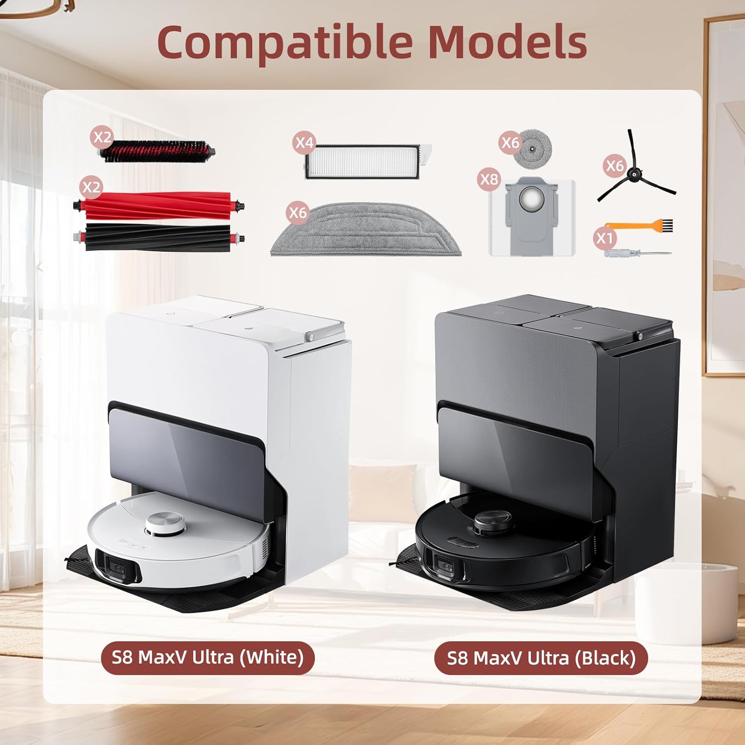 Compatible Models:These acceeories part compatible with Roborock S8 MaxV Ultra robot vacuum cleaner.They are engineered to perform as effectively as the original accessories,ensuring simple installation and a perfect fit for your vacuum cleaner