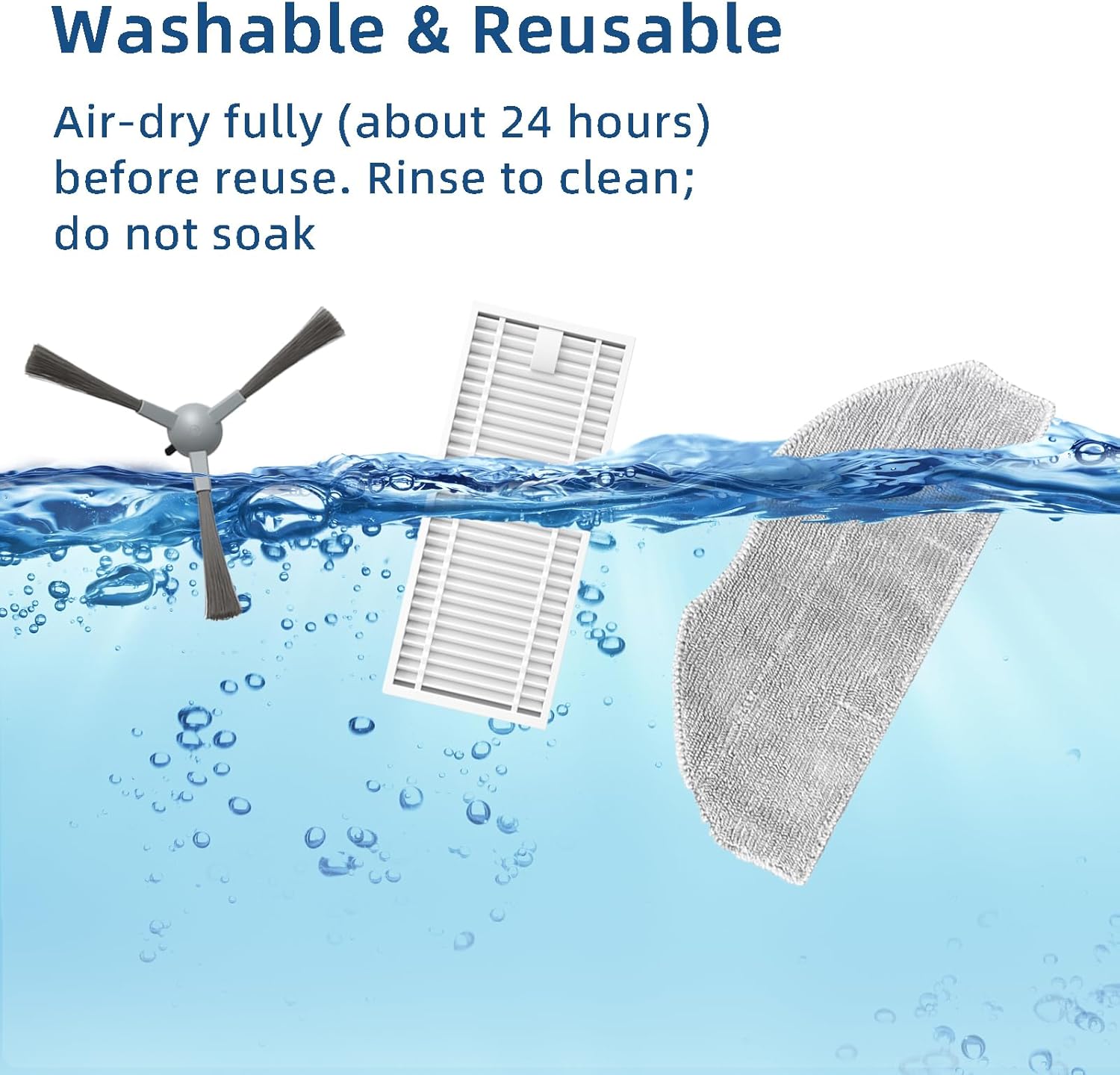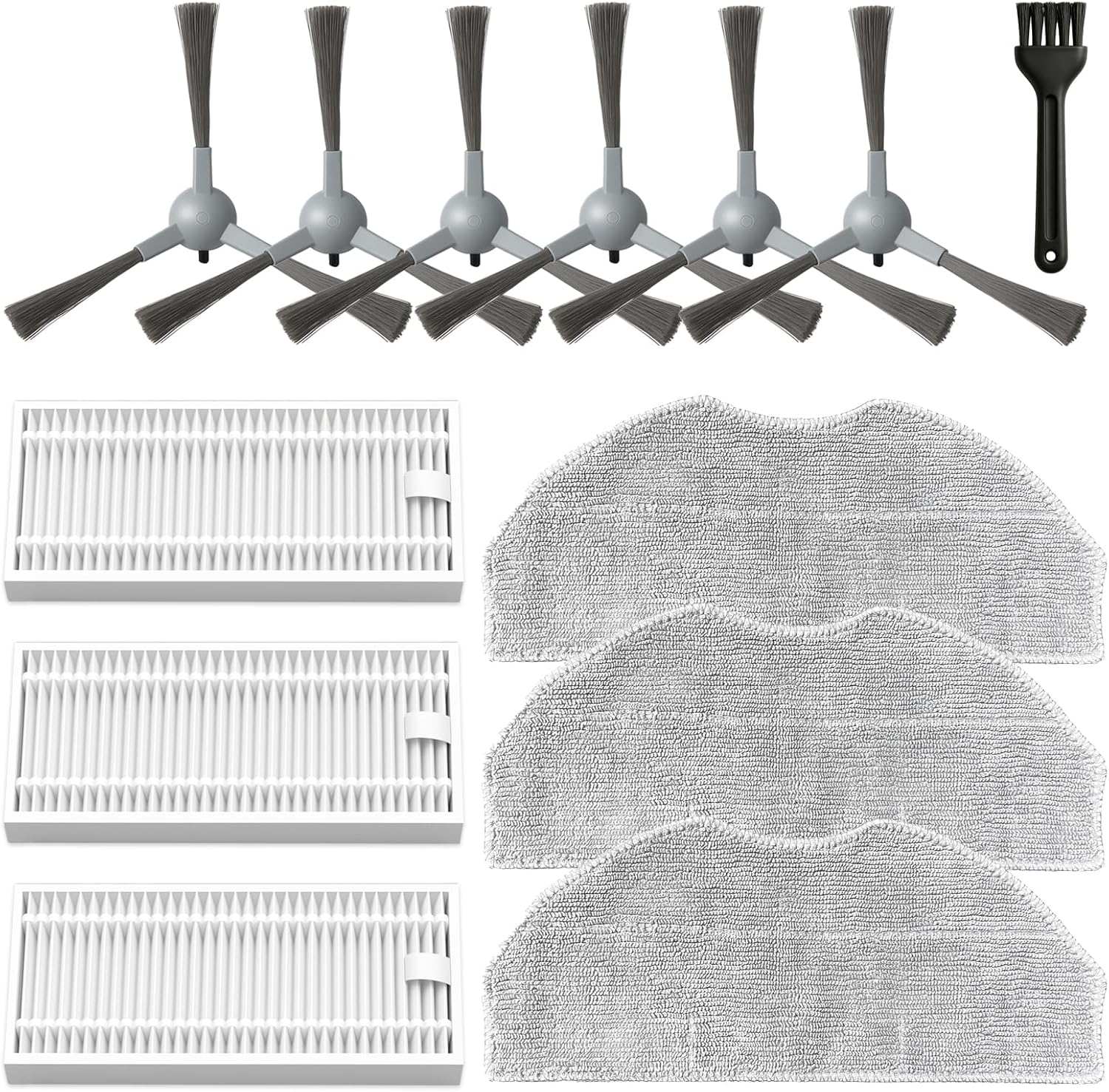 The kit includes 6 side brushes, 3 HEPA filters, and 3 mop pads.