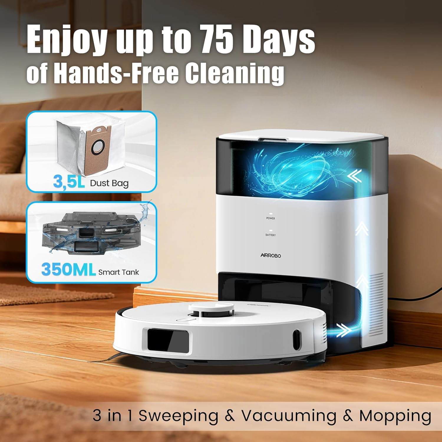 The AIRROBO Robot Vacuum and Mop has a self-emptying capacity of 75 days.