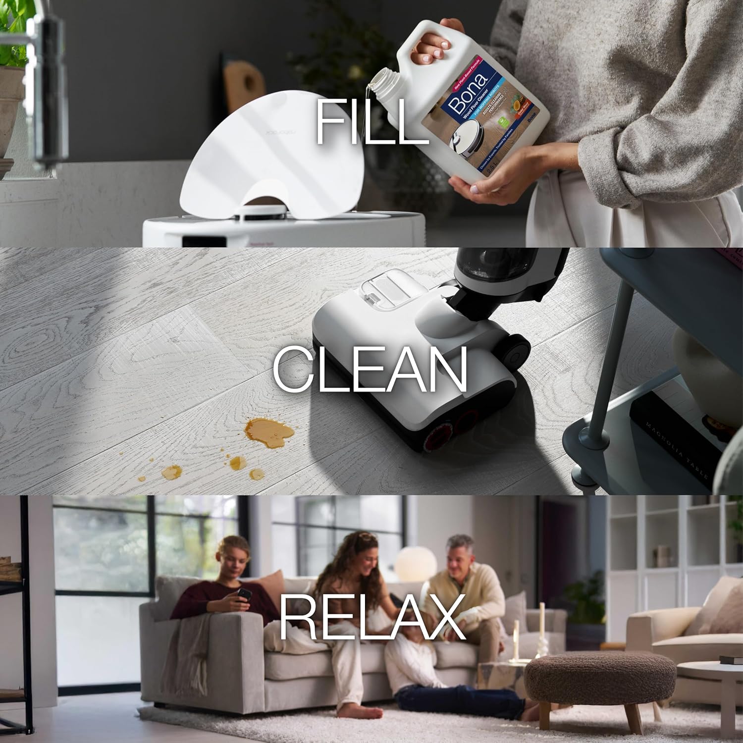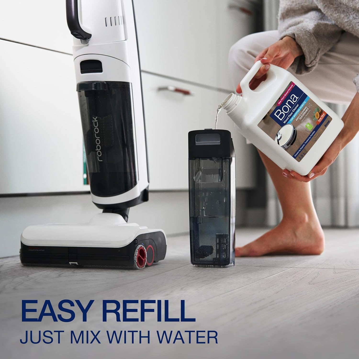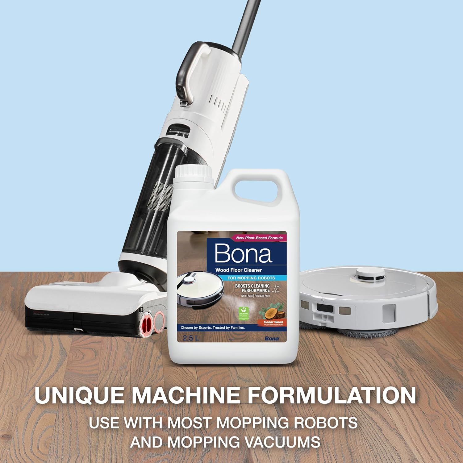 Flooring contractors agree, when looking for the best to care for wood floors, use Bona. Bona Wood Floor Cleaner is now available in a specially formulated solution designed for use with most mopping robots and mopping vacuums to boost the cleaning performance. This unique concentrate formula, with plant-derived ingredients, infused with essential oil of cedar wood scent, is specially developed for effective cleaning of varnished, waxed, or oiled wood floors to bring out your floor’s natural shine and beauty. Specifically designed to remove dust, dirt and grime safely from wood floors. It dries quickly, and doesn’t leave a residue behind. Love your floors with Bona. Waterbased solutions that are Greenguard Gold Certified to safely and efficiently clean wood floors.