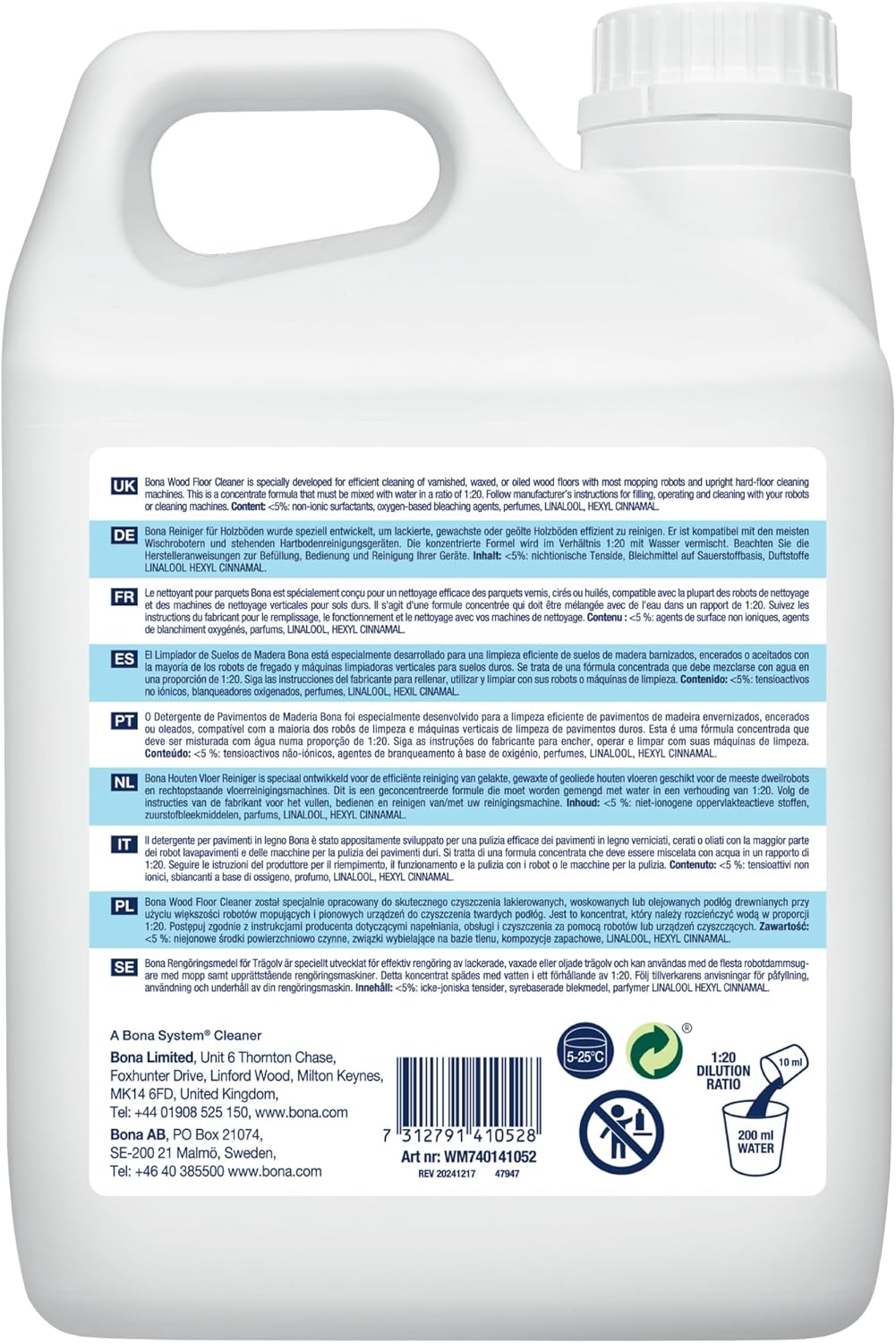 CONCENTRATE FORMULA – Must be mixed with water in a ratio of 1:20 before usage. For 200 ml of water, add a maximum of 10 ml floor cleaner.
