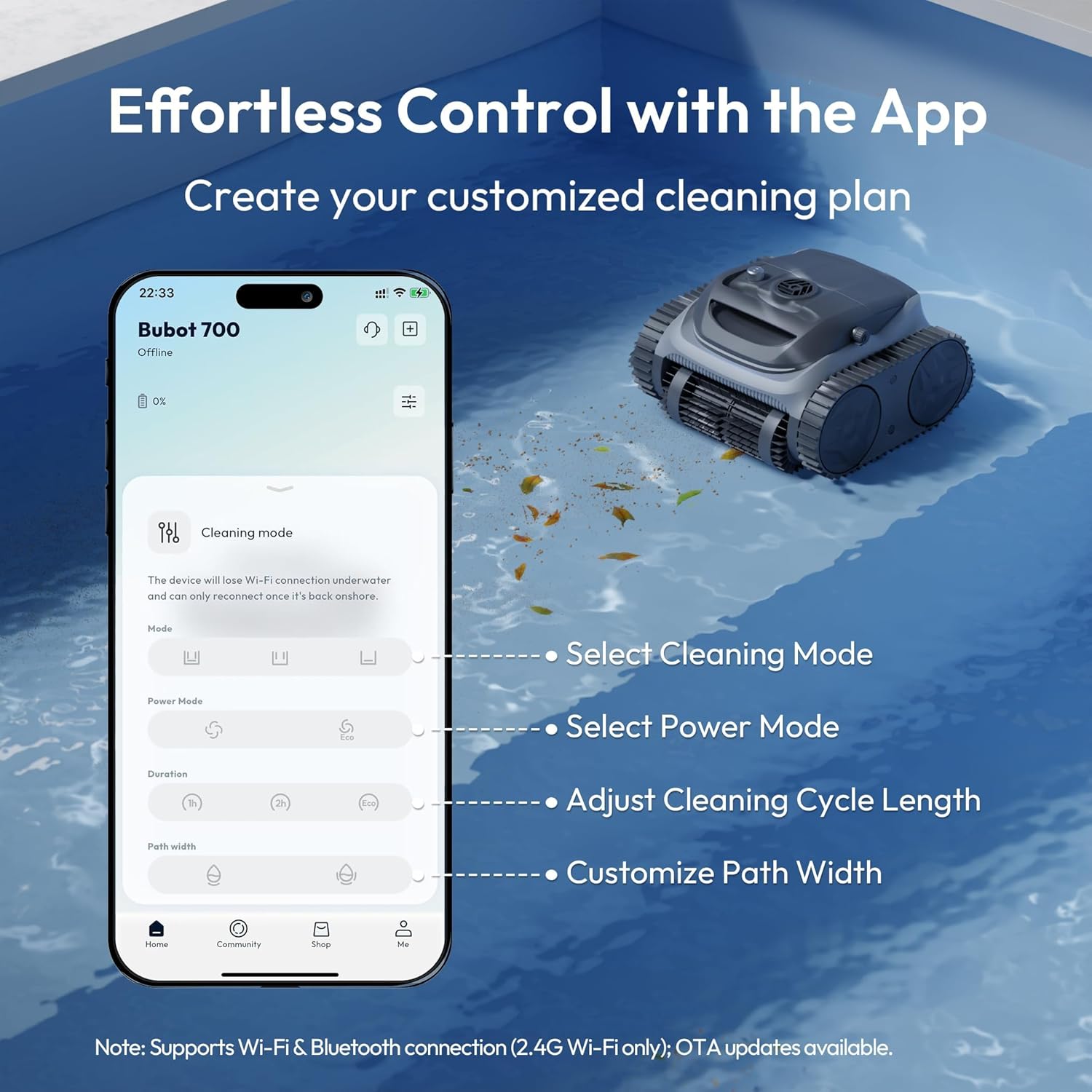 Smart APP Control: Take full control with the BUBLUE APP. Connect via Bluetooth or WiFi, monitor real time status, and easily upgrade with OTA updates. Choose your cleaning mode, duration, and path width—all from your phone