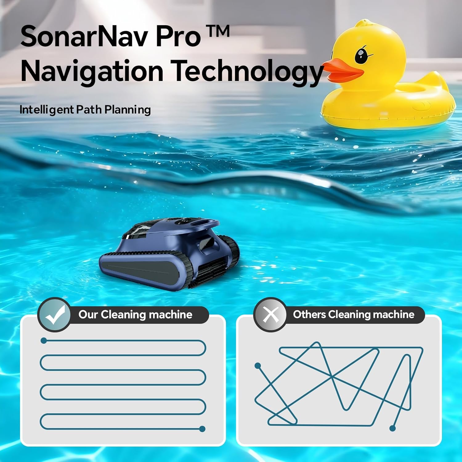 Advanced AI Navigation — Smarter Climbing, Better Coverage: Upgraded AI-based path planning intelligently analyzes pool depth, slopes, and climbing angles. Unlike basic robots, SAT30new Pool Vacuum can calculate climbing routes and actively return from deep areas to shallow zones, reducing missed spots and improving overall cleaning efficiency.