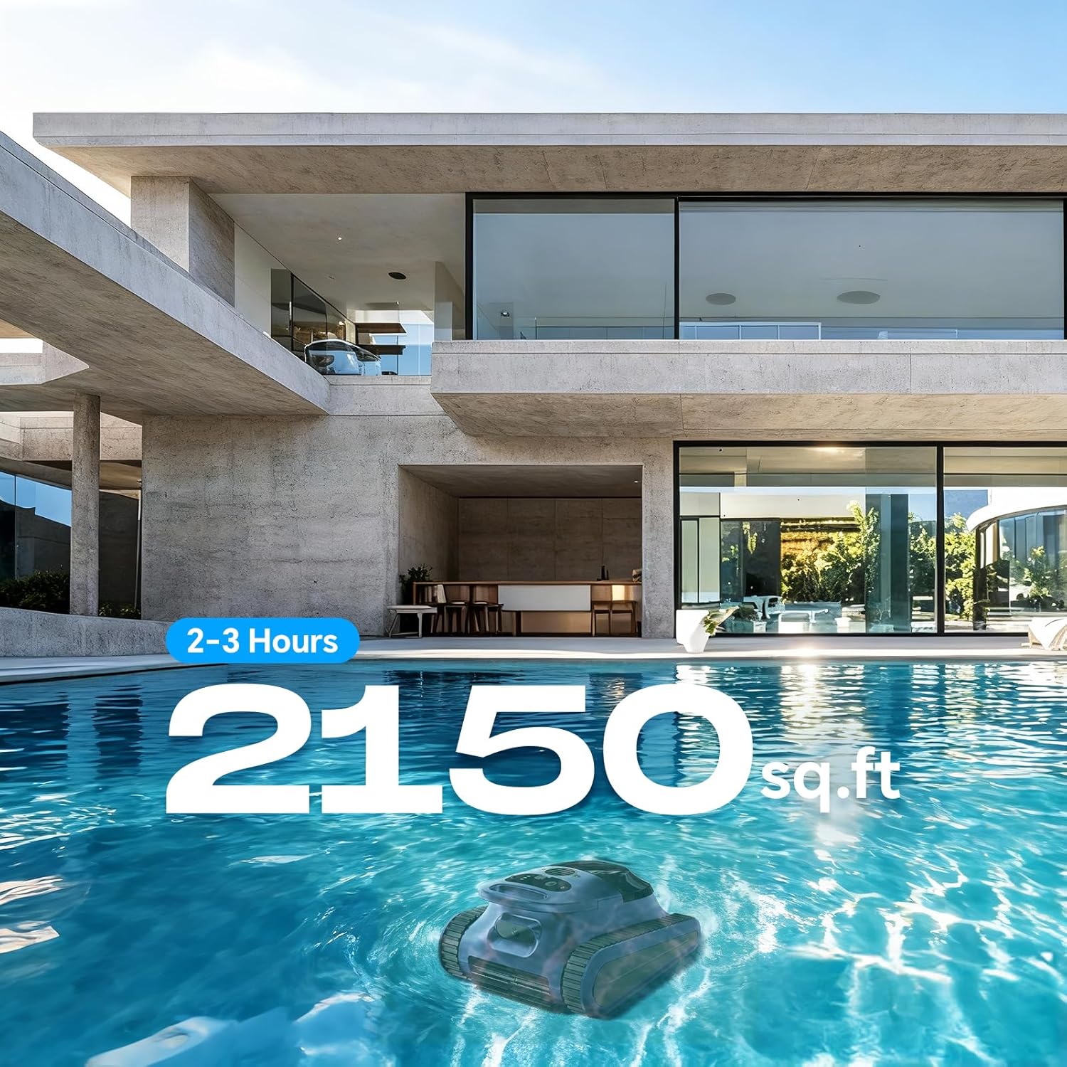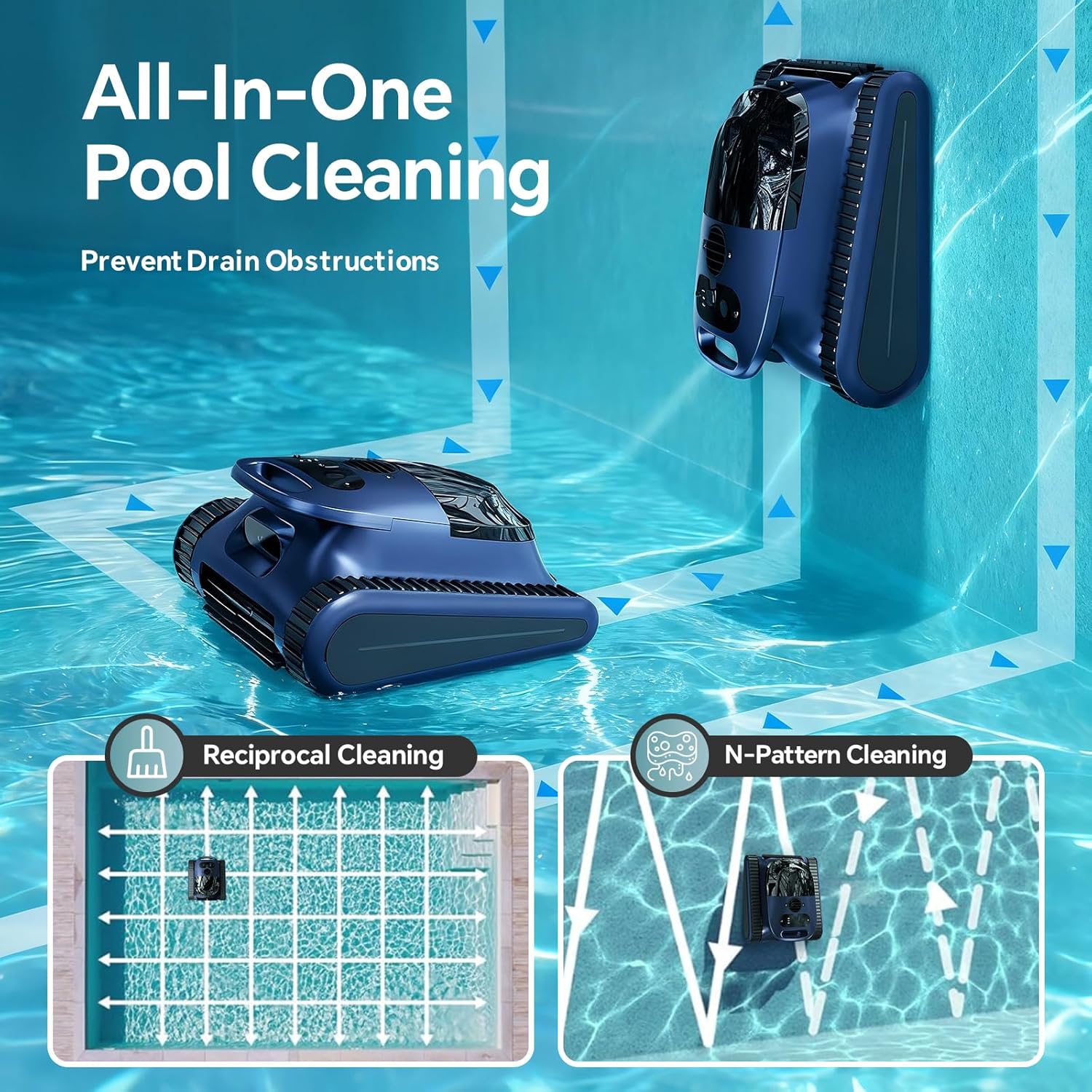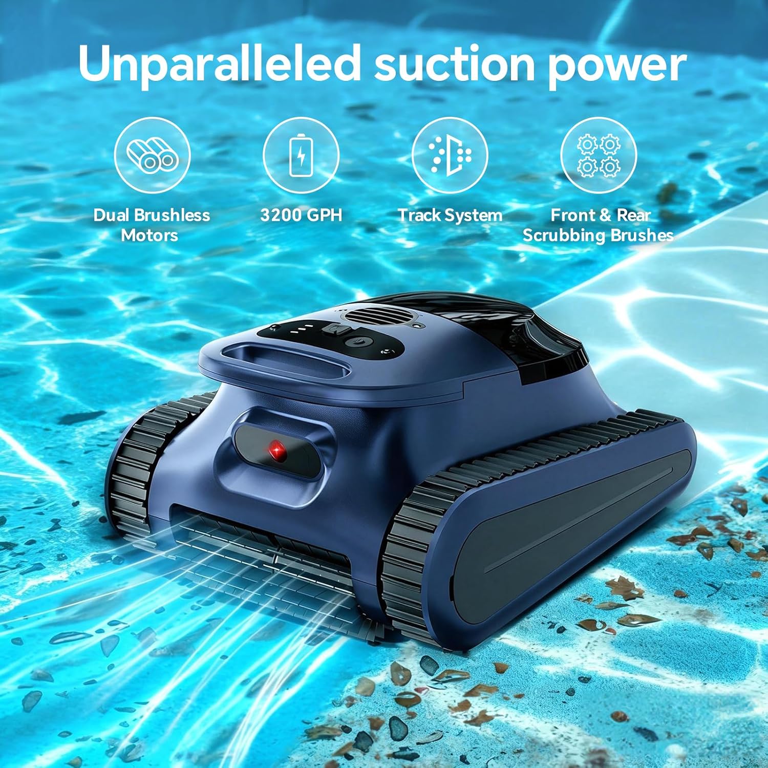 High-Powered Suction & Unrivaled Cleaning Performance:Driven by a 180W brushless motor and 45,000Pa suction power, this cordless pool vacuum efficiently removes leaves, dirt, and fine debris. Its ability to tackle uneven surfaces, steps, and drains ensures deep cleaning, providing superior debris removal and floor-to-wall coverage for a pristine pool.