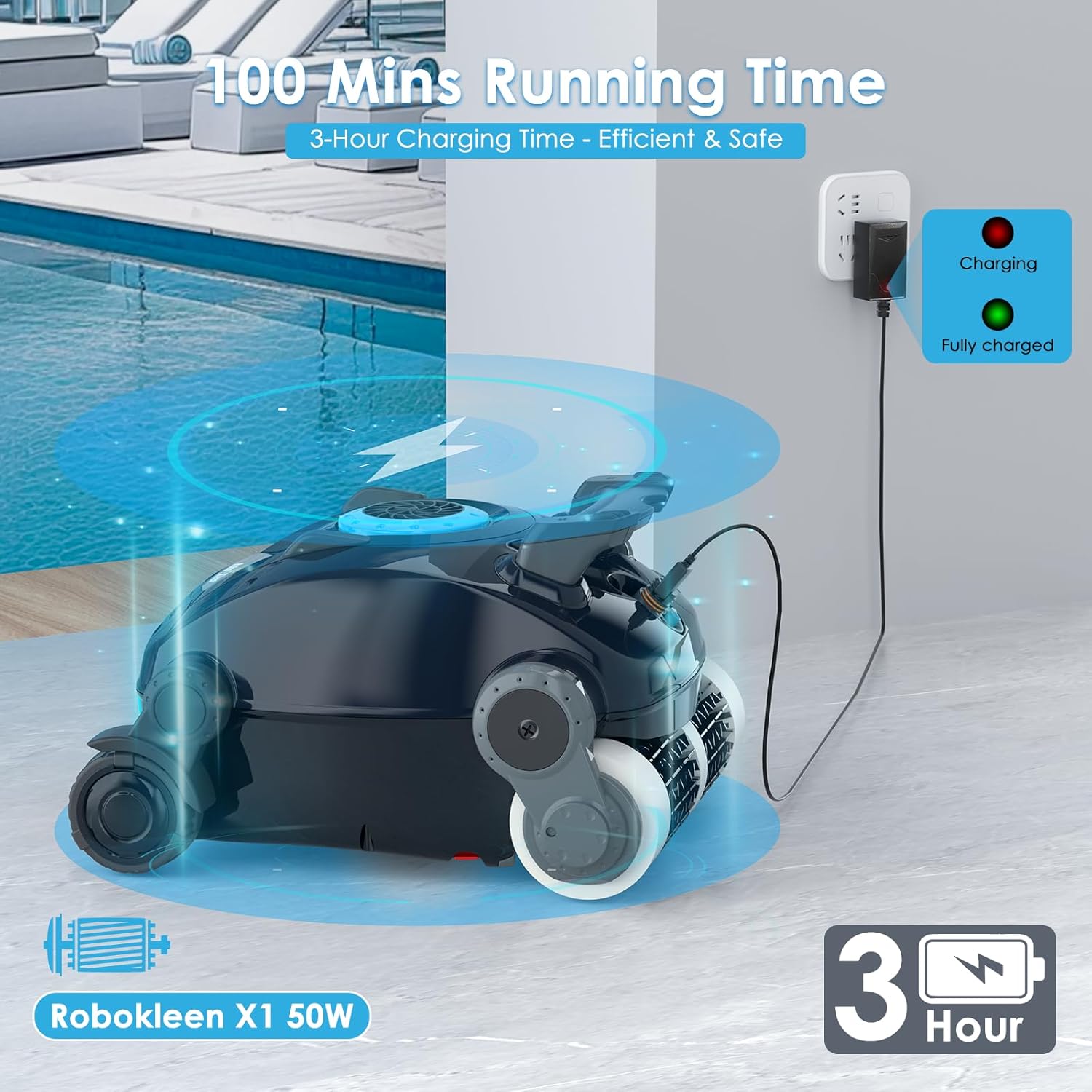 【Effortless Cleaning Power】Harness the strength of dual 50W motors that glide with agility and speed over pool floors, walls, and slopes. With an industry-exclusive Direct Dirt To Suction Port, enjoy effective dirt and debris removal for a full 100 minutes of operation;