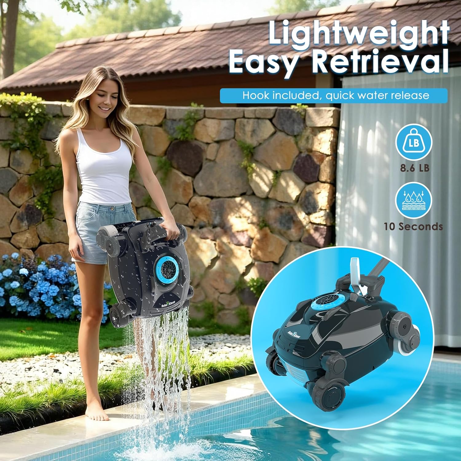 【Lightweight & Hassle-Free Operation】Weighing in at only 8.6 lbs is easy to lift and carry. A patented quick drain flap allows easy removal from the swimming pool. Forget complex setups or programming! No setup, syncing, or programming required– simply press a button and drop it into your pool for immediate cleaning, saving you valuable time;