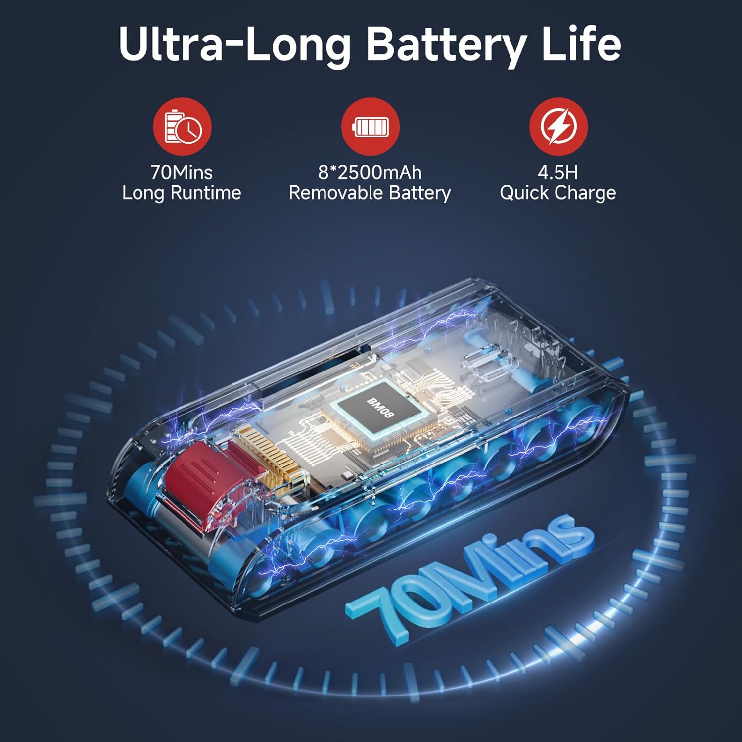 Long-Lasting Detachable Battery for Uninterrupted Cleaning:Enjoy up to 70 minutes of cleaning time in Eco Mode with our cordless vacuum cleaner. The detachable battery allows you to charge it separately for maximum convenience, and its long-lasting performance ensures you can cover large areas in one go. Whether it’s a quick tidy-up or an extensive vacuuming session, this rechargeable stick vacuum cordless has you covered
