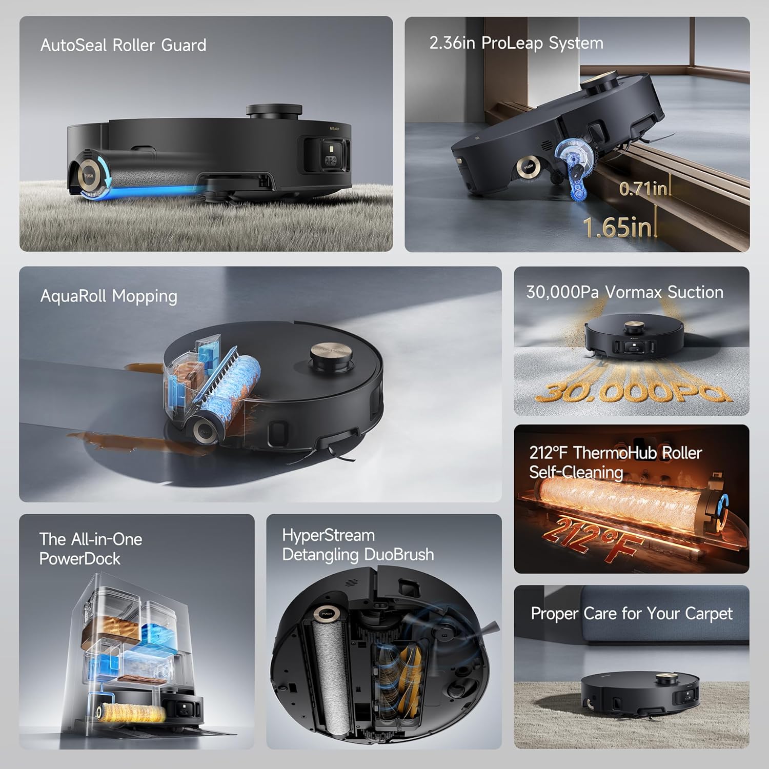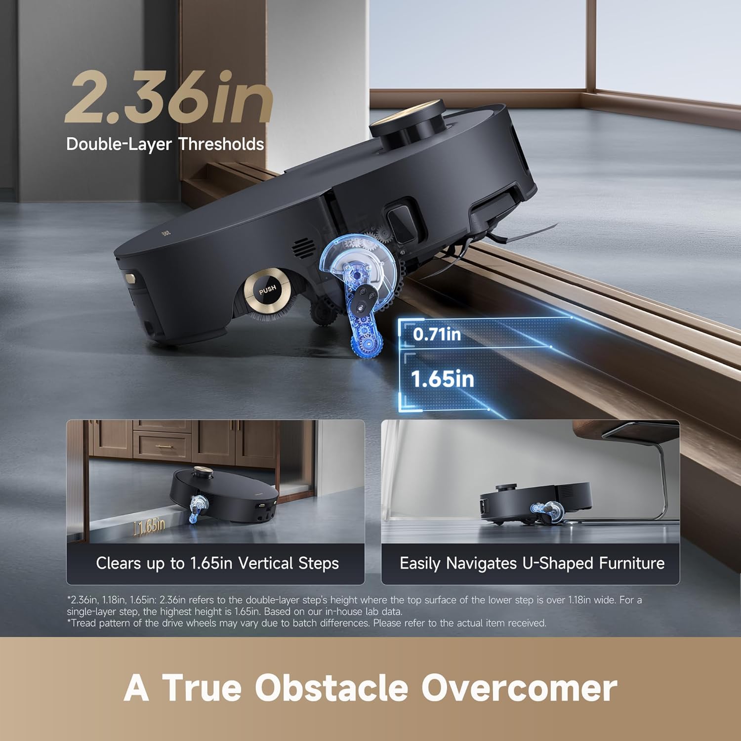 No Obstacles Stand in Its Way: Climbs up to 2.36in steps, crosses cleaning thresholds and door tracks, and navigates U-shaped furniture and complex areas.