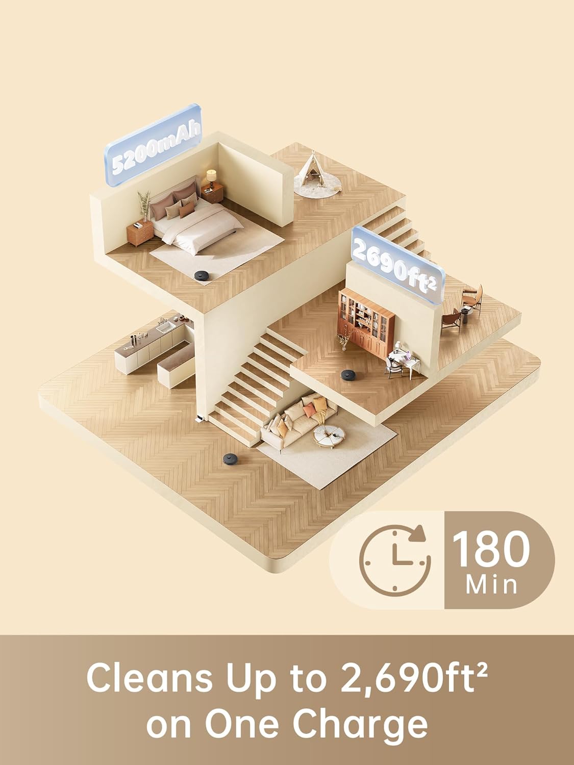 150 mins Overlong Runtime: The 5200mAh high capacity battery reaches up to 150 minutes of run-time, and it can clean 2690 sqft; and It makes your cleaning last longer