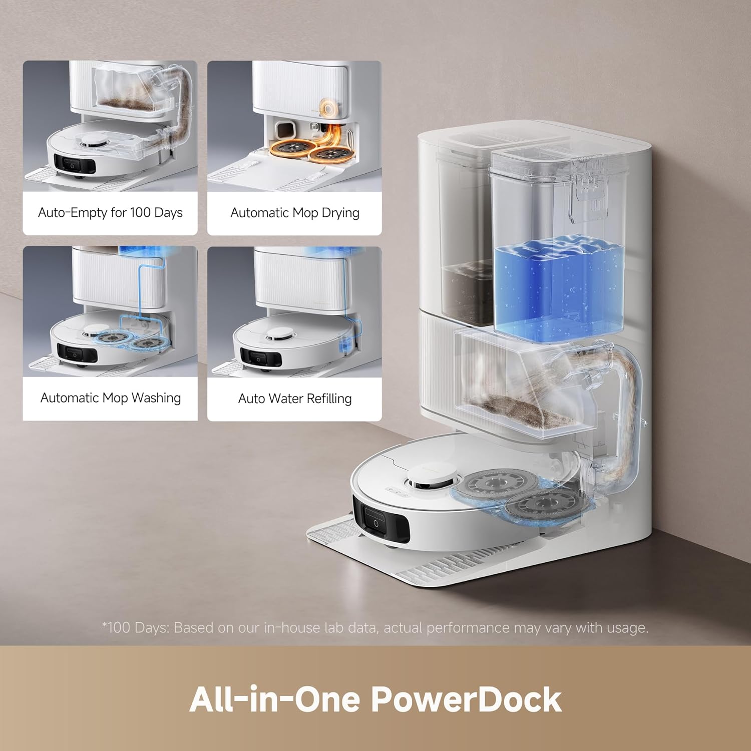 All-in-One Self-Emptying Base: The robot vacuum self emptying PowerDock station automates maintenance by refilling water, washing mopping pads, and providing hot air drying. As a self-emptying robot vacuum, it holds up to 100 days of dust, offering a truly hands-free cleaning experience.