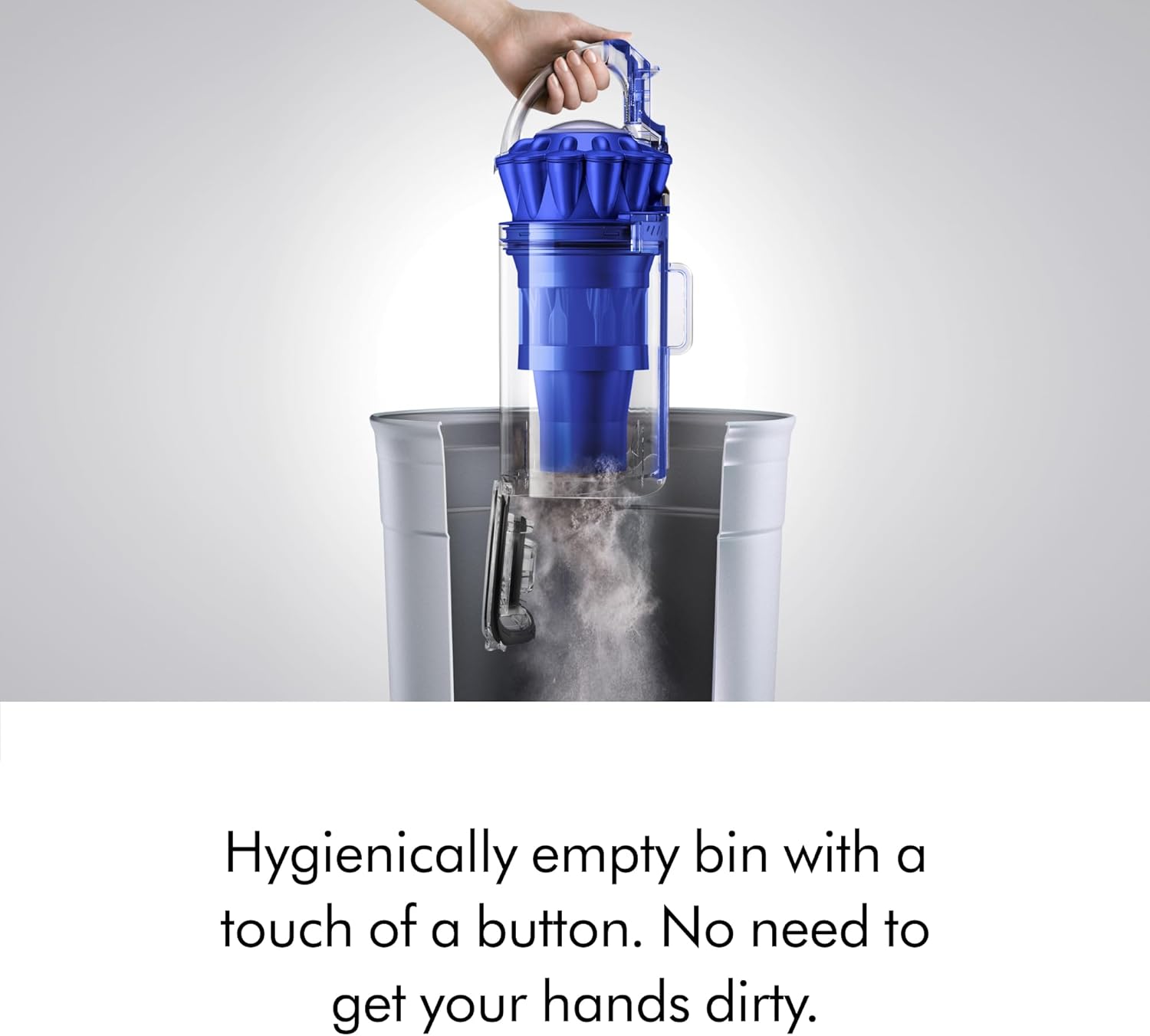 The vacuum has hygienic bin emptying; you simply push a button to release the dirt without getting your hands dirty.