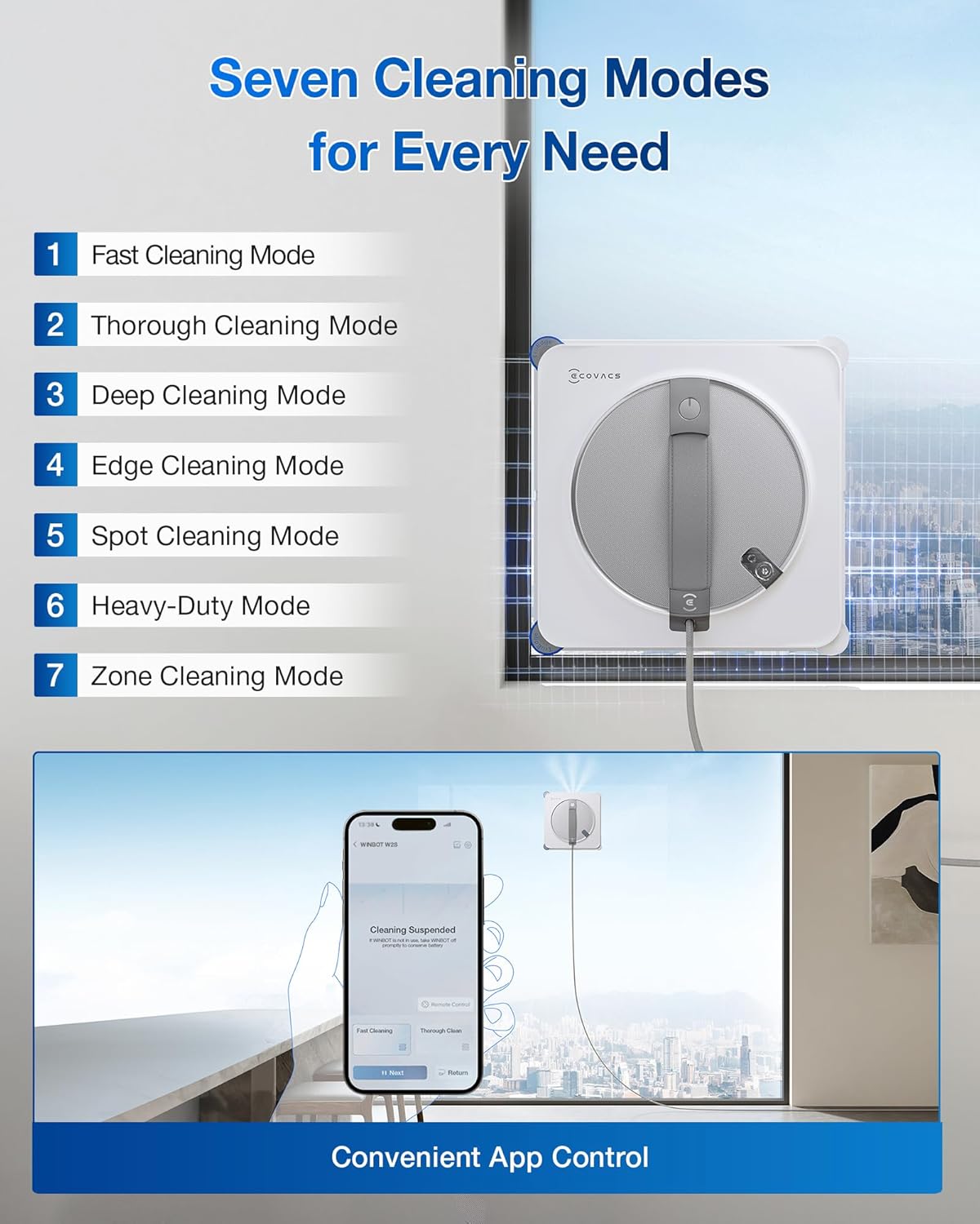 Wired Mode for Continuous High-Coverage Cleaning: Large indoor windows need long runtime. Use wired mode to achieve uninterrupted operation, extending battery life and ensuring your window cleaning robot is always ready when you need it.