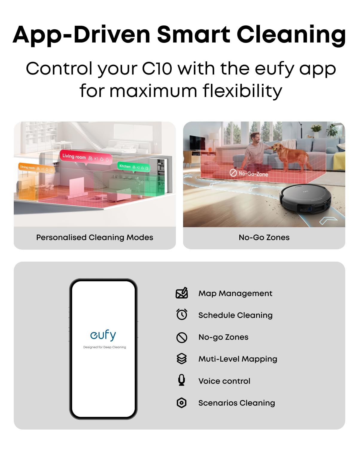 The eufy C10 is designed for extended cleaning sessions and will return to its charging dock automatically when the battery is low, ensuring it is always ready for the next cleaning cycle.