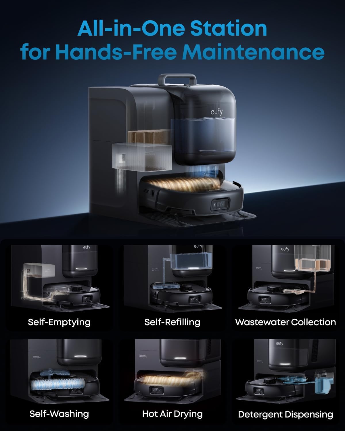 All-in-One Station with Auto Mop Washing for Total Convenience: Streamlines maintenance with self-emptying, self-washing roller mops, self-refilling, and more, supporting fully autonomous cleaning cycles.