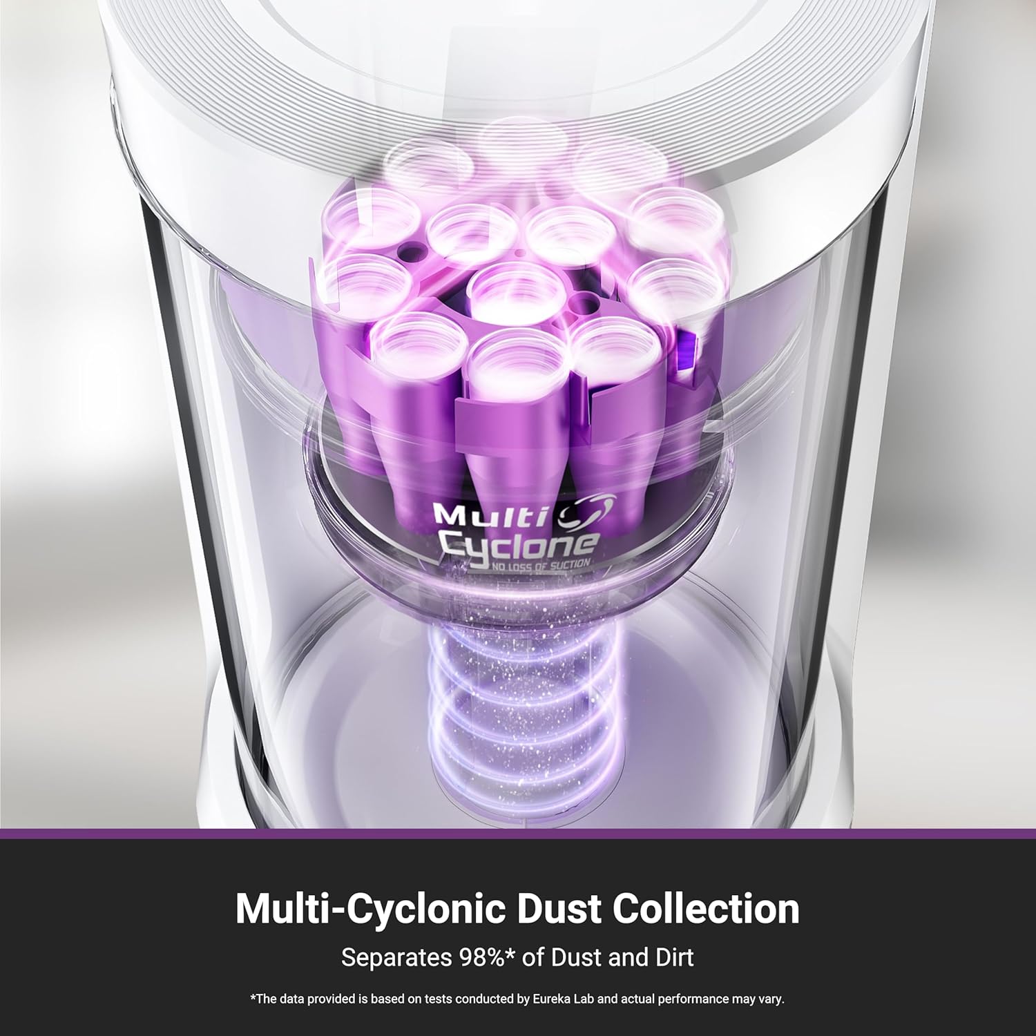 【Multi-Cyclonic Dust Collection】Eureka E20 Plus self-emptying robot vacuum cleaner comes equipped with a 13-cone structure, multi-cyclonic separation technology combines with powerful centrifugal force, generated by the suction during dust collection, to separate 98%* of dust and dirt before they reach the filter.