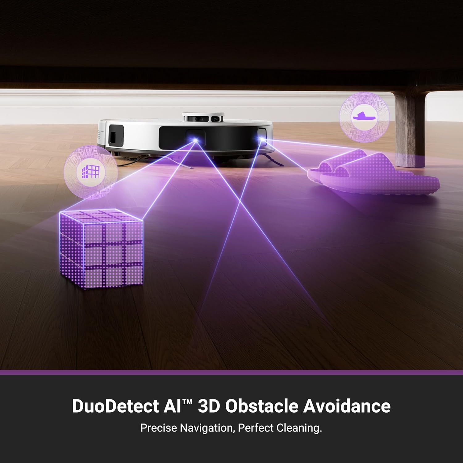 DuoDetect AI™ 3D Obstacle Avoidance. Greater precision, reduced confusion. It features two LiDAR Light Detecting Sensors (LDS) on the front, functioning similarly to human eyes, which greatly enhance its precision in navigating and dynamically sensing obstacles.