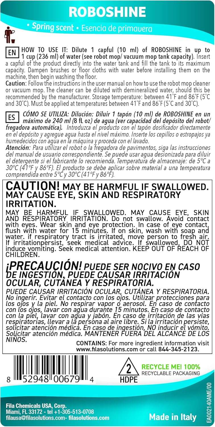 FILA Surface Care Solutions, ROBOSHINE, Detergent for All Robot Vacuum and Mop Combo and Wet Dry Vacuum Cleaner, Up to 100 Washes, Hard Floor Cleaner Mop Liquid for All Floor Tiles, 1Qt